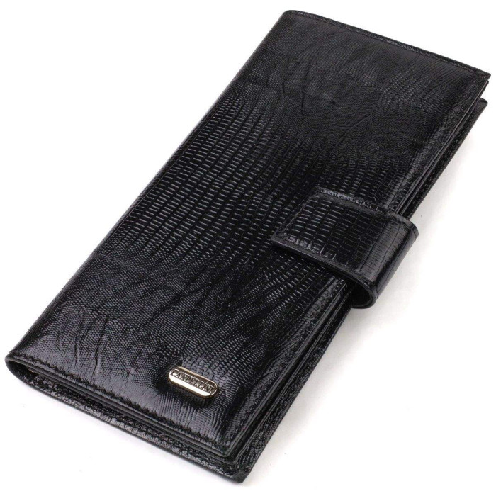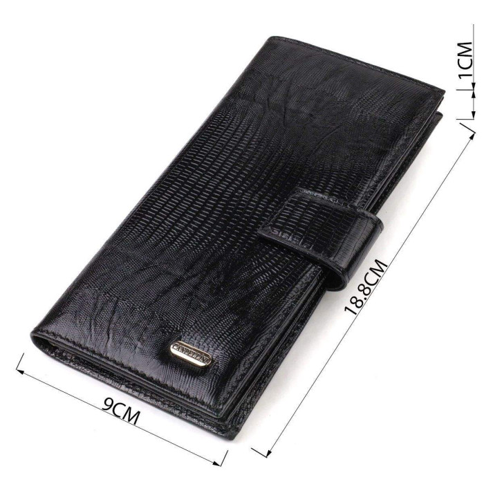 Практичний чоловічий гаманець із натуральної фактурної шкіри із тисненням. Аксесуар має одне основне відділення для купюр усіх номіналів, одинадцять осередків для карток, кишеню під сіточкою для пропуску та дві приховані кишені. Закривається аксесуар навпіл хлястиком на кнопку. На лицьовій стороні, у правому нижньому куті металевий логотип компанії виробника. Купуючи шкіряний аксесуар цієї фірми, собі або на подарунок, будьте певні, що він прослужить Вам не один рік.