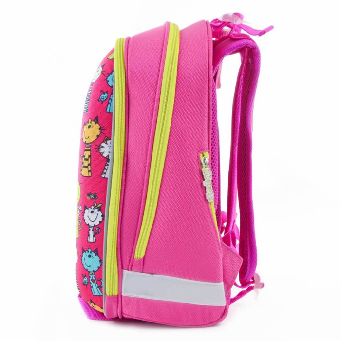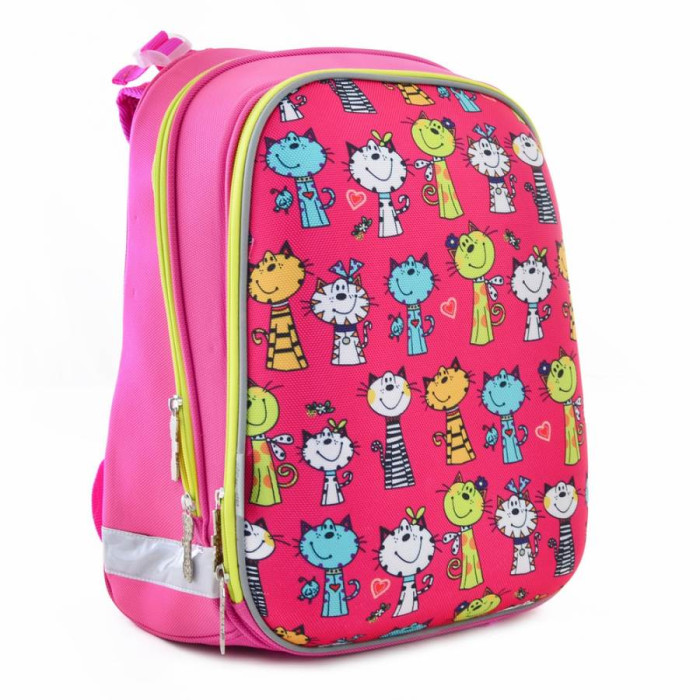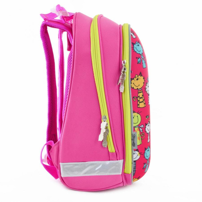 Габарити: 29х38х15 см Об'єм: 16 літрів Вага: 1150г. Основний матеріал: поліестер. Особливості: Щільний жорстко-каркасний рюкзак на два відділення. Має жорстку спинку, яка повторює форму хребта, перешкоджає його викривленню і сприяє формуванню правильної постави. Унікальна система кріплення лямок дозволяє виставити максимально комфортну висоту щодо спини дитини. 2 потайні кишені з сіточкою для пляшки з водою. Посилене дно із захисними ніжками. Додатково: водовідштовхувальний; наявність відділення для лептопу, органайзера, телефону. Світловідбиваючі елементи - 6 шт.