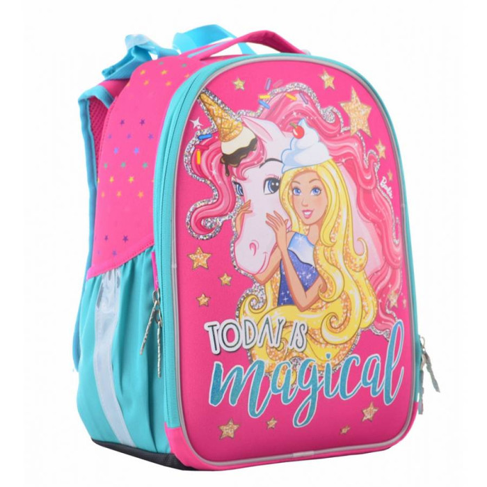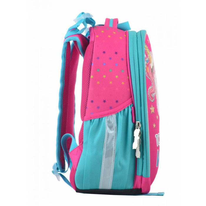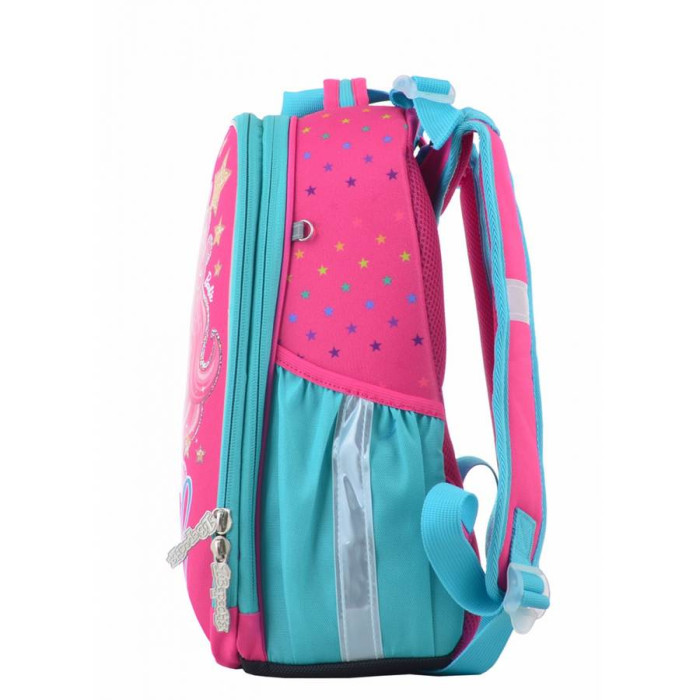 Габарити: 26х35х16 см Об'єм: 14 літрів Вага: 900г. Основний матеріал: поліестер. Особливості: рюкзак призначений для молодших школярів, має два основних відділи. Всередині сітчаста кишеня, роздільник для зошитів, а також кишенька-гаманець. Вся поверхня рюкзака має жорсткі вставки, передня EVA-панель захищає його від пошкоджень, дно посилене цупкою матерією.. Додатково: водонепроникний, 1 світловідбиваючий елемент