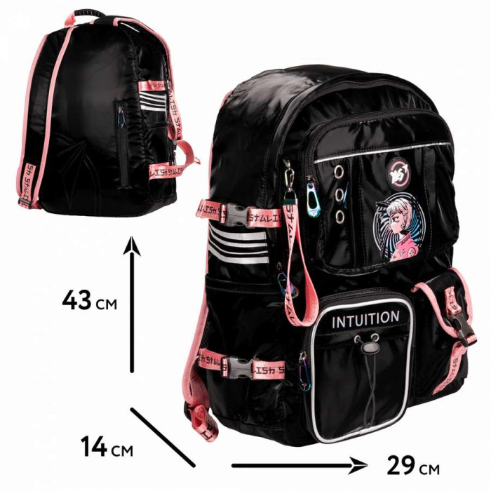 Yes Intuition Т-107 – це чарівне поєднання елегантного чорного з рожевими акцентами. Ієрогліфи доповнюють загальний концепт рюкзака, даруючи йому загадковість. Тканина рюкзака