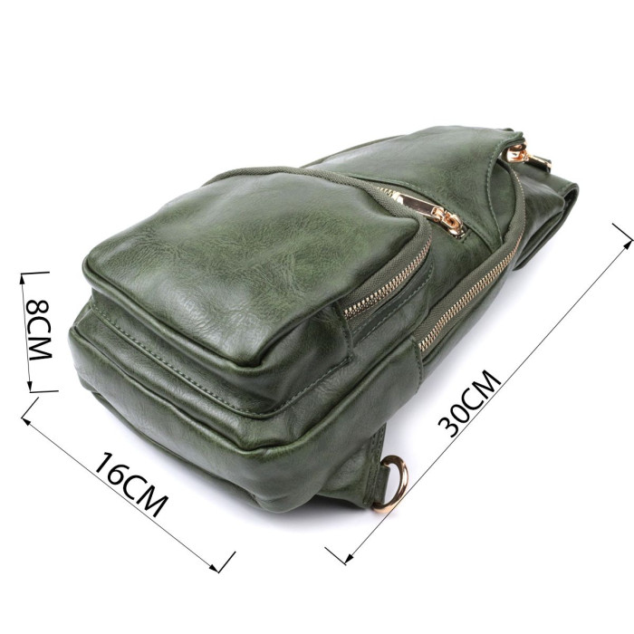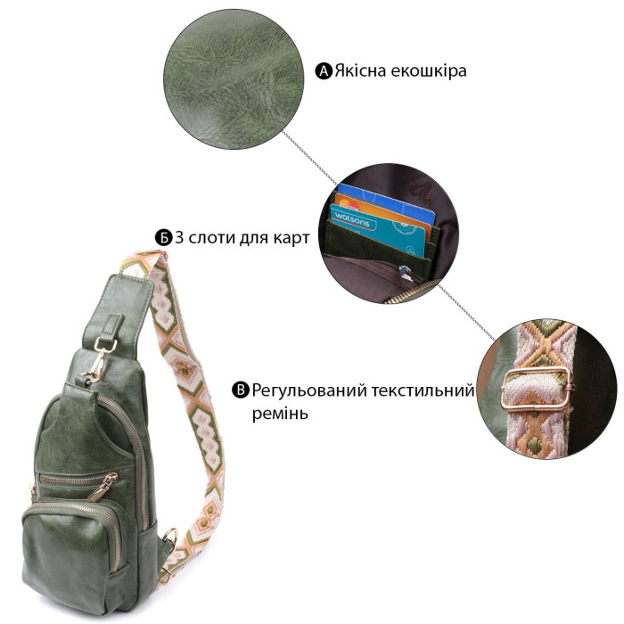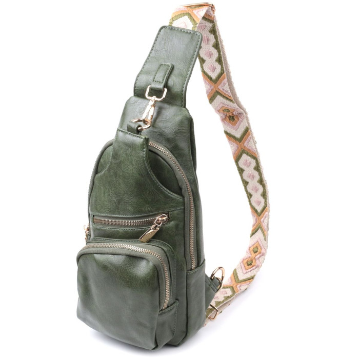 Екошкіра – високоякісна альтернатива натуральному матеріалу, яка дуже стійка до тертя, до низьких температур, відмінно носиться на відміну від інших штучних матеріалів, а також має гіпоалергенний склад на відміну від натуральної шкіри. Пропонуємо до Вашої уваги зручну слінг сумку з екошкіри в модному зеленому кольорі. Ця модель складається з одного основного відділення, яке закривається на блискавку і в якому знаходиться кишеня на блискавці і три кишені для кредитних карток, а також три кишені зовні та один отвор для кабелю або навушників, що дуже зручно в сучасному світі. Основною фішкою моделі є зручний регульований плечовий ремінець у етнічному стилі, що дуже модно вже кілька сезонів.