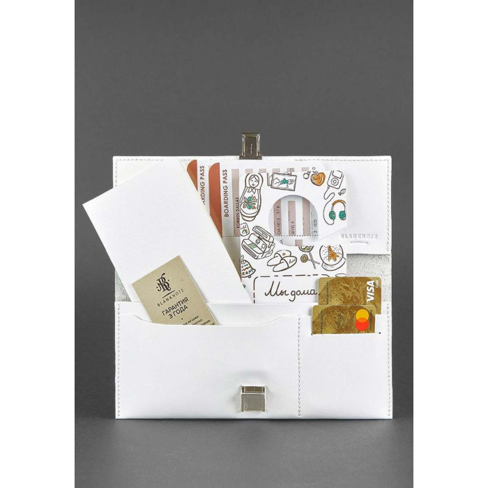 Всередині є кілька відділень для документів і грошей, також є невеликі кишеньки, в яких можна розташувати пластикові карти і візитки. Закривається холдер на металевий портфельний замок.