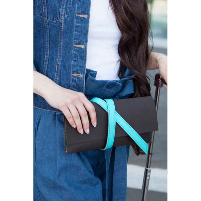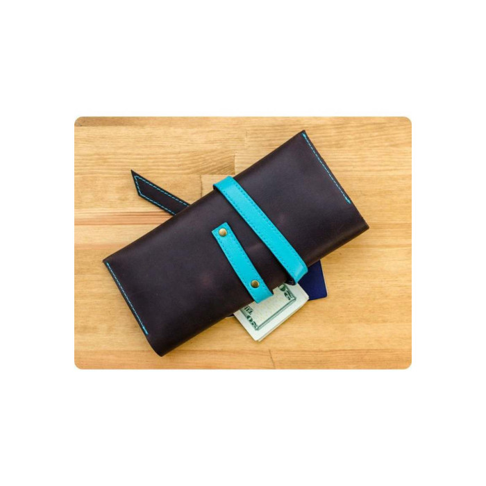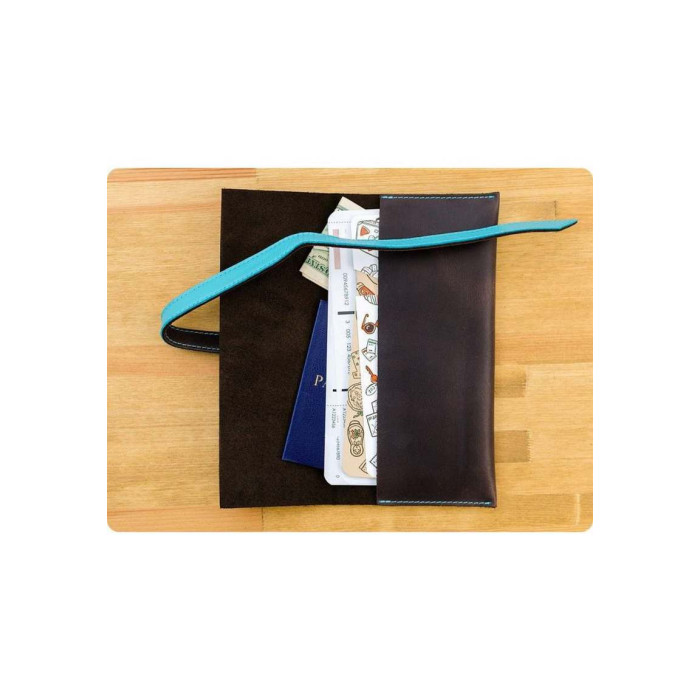 Це холдер для документів зручного розміру, в якому помістяться посадочні талони (або залізничні квитки, паспорти, гроші і маса інших корисних речей, які повинні бути завжди під рукою у подорожі. Холдер зроблений повністю вручну з цільного шматка дуже щільною (2 мм) натуральної шкіри. Закривається він на шкіряний хлястик, який кріпиться двома люверсами, за сумісництвом формують тримач для канцелярського приладдя.