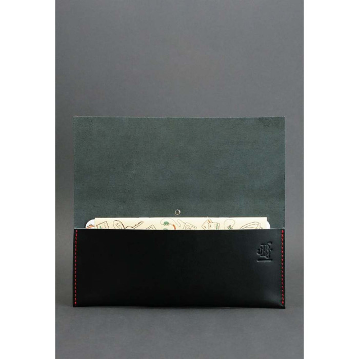 Це холдер для документів зручного розміру, в якому помістяться посадочні талони (або залізничні квитки, паспорти, гроші і маса інших корисних речей, які повинні бути завжди під рукою у подорожі. Холдер зроблений повністю вручну з цільного шматка дуже щільною (2 мм) натуральної шкіри. Закривається він на шкіряний хлястик, який кріпиться двома люверсами, за сумісництвом формують тримач для канцелярського приладдя.