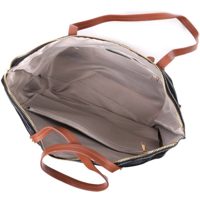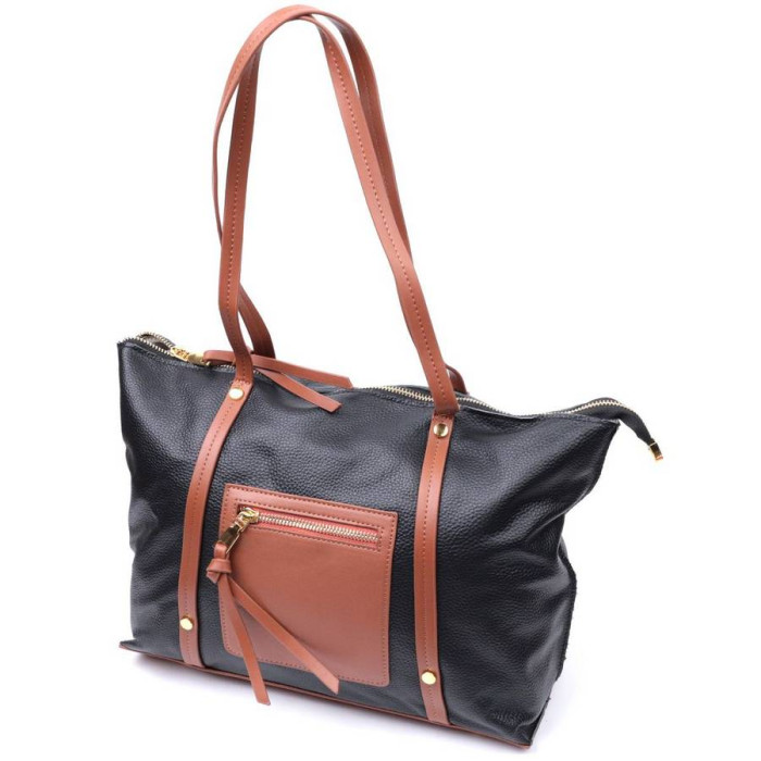 Жіноча велика сумка, у поєднанні двох кольорів чорного та коричневого. Пошито виріб з натуральної шкіри флотар, яка невибаглива у догляді та довго носиться. Аксесуар складається з двох відділень та трьох кишень на блискавках різної величини. Носити сумку можна на плечі та в руках, для цього є подовжені шкіряні ручки. В аксесуарі використано якісну фурнітуру кольору жовтого золота.