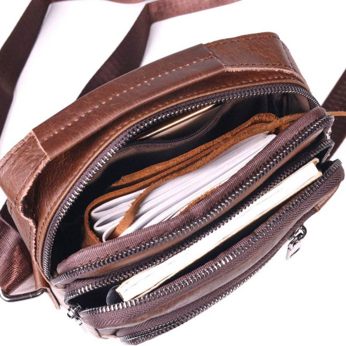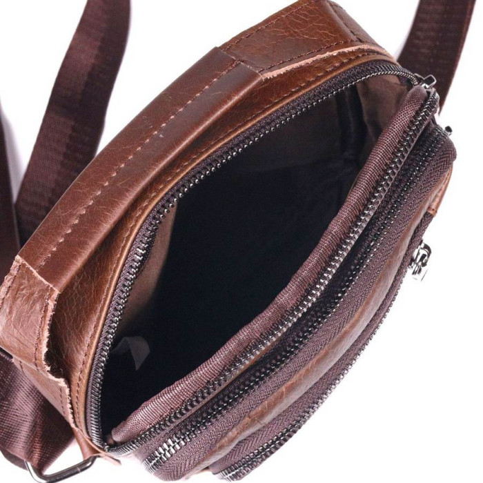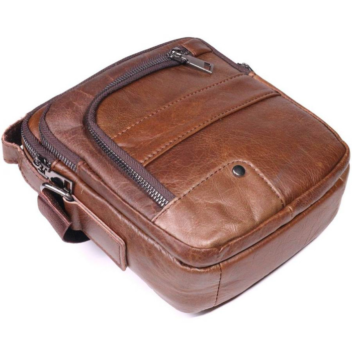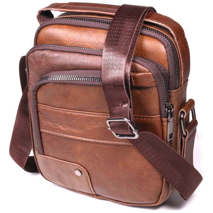Зручна якісна чоловіча сумка з натуральної шкіри високої якості виконання. Має стриманий та стильний дизайн. Колір виробу світло-коричневий, що виглядає дуже красиво та сучасно. У цій моделі передбачено містке основне відділення та просторі зовнішні кишені на блискавці.