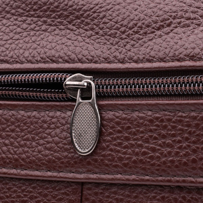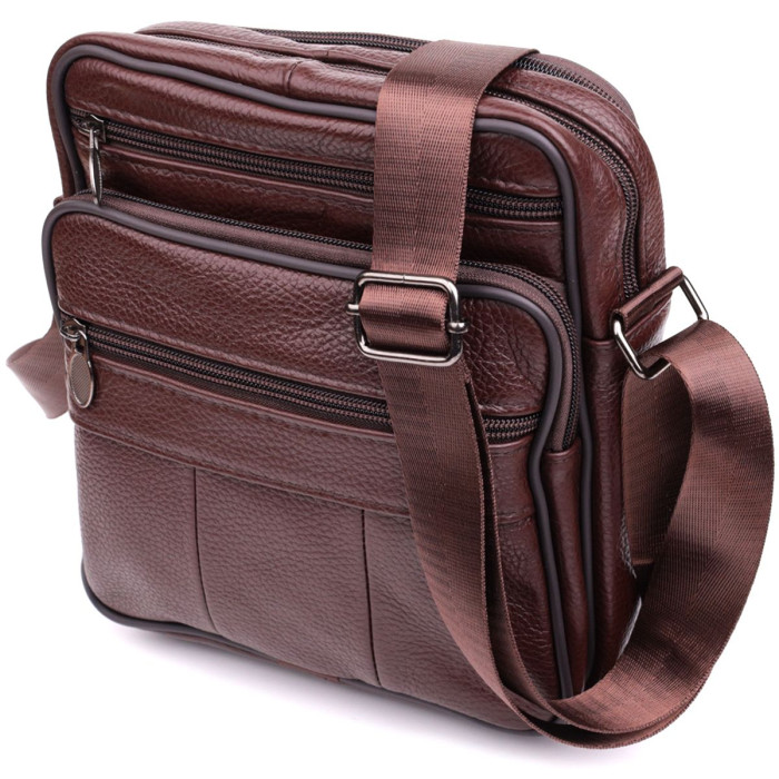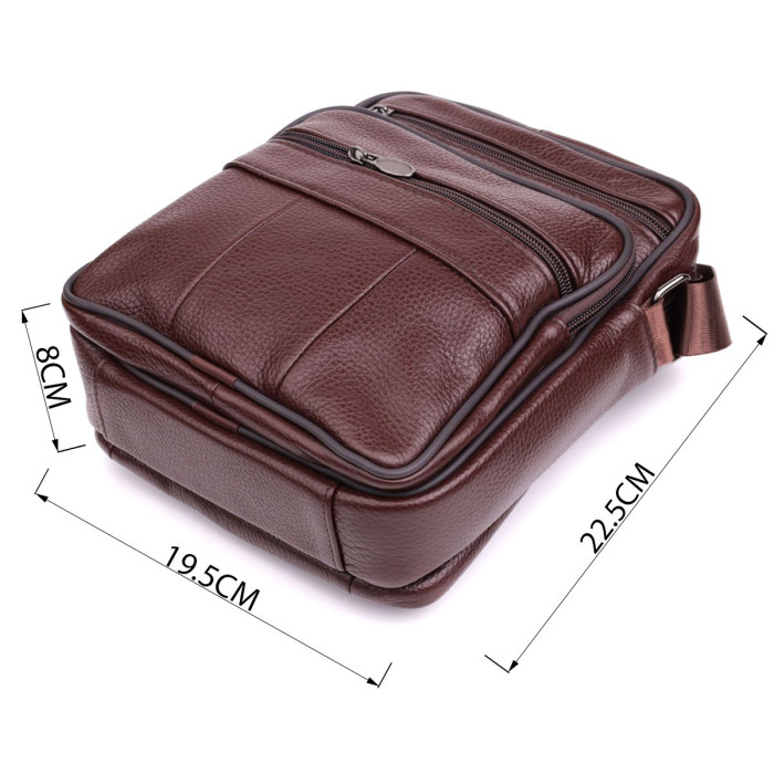 Солідна чоловіча сумка з натуральної шкіри, у коричневому кольорі, з якісною фурнітурою. Аксесуар зовсім не вибагливий у догляді та користується особливою популярністю у чоловіків. Усередині сумки щільна текстильна підкладка. По краях аксесуар прошитий рівним рядком. Сумка стане чудовим подарунком для будь-якого чоловіка.