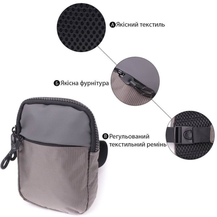 Перед Вами найзручніший варіант сумки слінг бег, яка підійде як для повсякденного використання, так і подорожі, коли всі цінні речі повинні бути в безпечному місці і під рукою. Аксесуар виготовлений з якісного текстилю сірого кольору, з контрастними вставками чорного кольору, що надає йому ексклюзивного вигляду та стилю. У моделі використано якісну фурнітуру чорного кольору. Сумка легко вміщує паспорт, телефон, ключі, гаманець та ще кілька дрібниць. Якщо Ви шукаєте зручну та легку сумку, яка задовольнить Вас за такими параметрами, як - міцність, практичність, місткість, ексклюзивність, універсальність, то ця модель перед Вами, вона має всі вище перелічені якості та стане одним з Ваших улюблених аксесуарів.