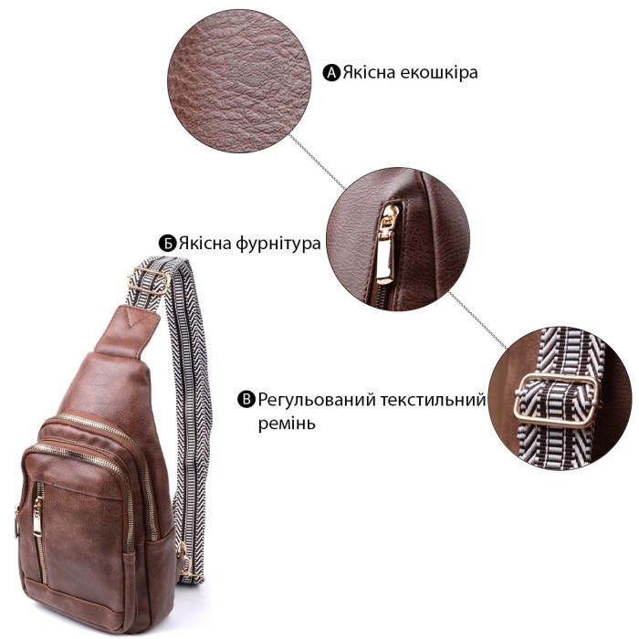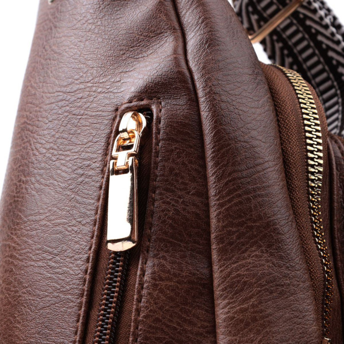 Практична слінг сумка з якісної екошкіри, в коричневому благородному кольорі. Екошкіра – високоякісна альтернатива натуральному матеріалу, яка дуже стійка до тертя, до низьких температур, відмінно носиться на відміну від інших штучних матеріалів, а також має гіпоалергенний склад на відміну від натуральної шкіри. Дана модель складається з одного основного відділення, яке закривається на блискавку і в якому знаходиться потайна кишеня, а також трьох кишень зовні та одного отвору для кабелю або навушників, що дуже зручно в сучасному світі. Основною фішкою моделі є зручний регульований плечовий ремінець із стильним візерунком. Відмінний варіант сумки на кожен день та у будь-який сезон.