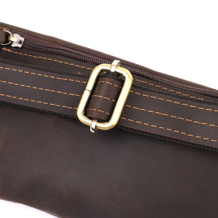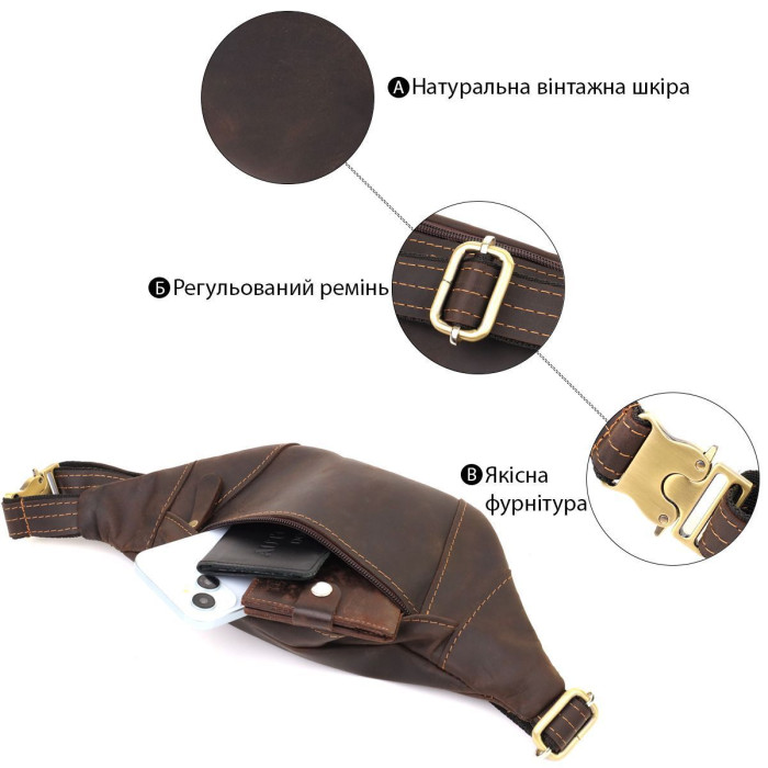 Виконана з міцної натуральної вінтажної шкіри, доповнена надійною металевою фурнітурою та ременем, що регулюється. Ідеальний дизайн робить її стильним рішенням для чоловіка. Лаконічний дизайн і увага до деталей роблять її універсальною: чи то поїздка, прогулянка містом чи ділова зустріч — аксесуар виглядатиме доречно в будь-якій ситуації.