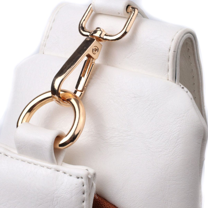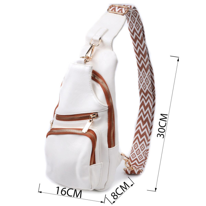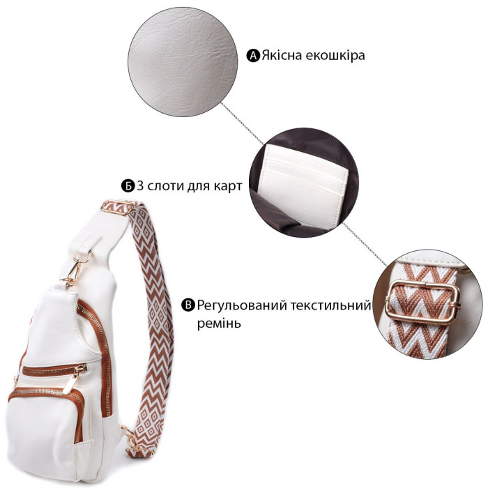 Екошкіра – високоякісна альтернатива натуральному матеріалу, яка дуже стійка до тертя, до низьких температур, відмінно носиться на відміну від інших штучних матеріалів, а також має гіпоалергенний склад на відміну від натуральної шкіри. Пропонуємо до Вашої уваги зручну слінг сумку з екошкіри в білому кольорі з коричневими акцентами. Ця модель складається з одного основного відділення, яке закривається на блискавку і в якому знаходиться кишеня на блискавці і три кишені для кредитних карток, а також три кишені зовні та один отвор для кабелю або навушників, що дуже зручно в сучасному світі. Основною фішкою моделі є зручний регульований плечовий ремінець у етнічному стилі, що дуже модно вже кілька сезонів.