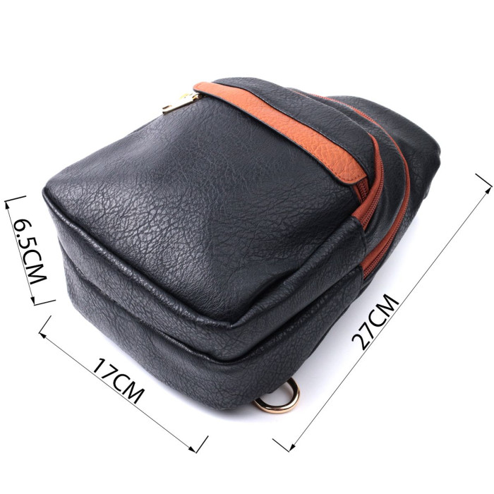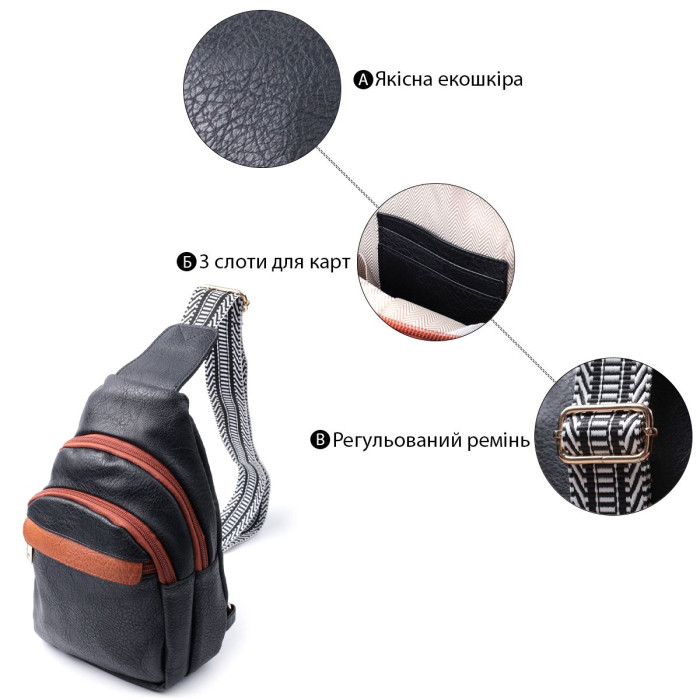 Оригінальний варіант сумки для жінок на кожен день із якісної екошкіри, яка є альтернативою натуральній шкірі. Дана модель складається з одного основного відділення, яке закривається на блискавку і в якому знаходиться кишеня на блискавці і три кишені для кредитних карток усередині, а також трьох кишень зовні та одного отвору для кабелю або навушників, що дуже зручно в сучасному світі. Акцентом даної моделі є зручний регульований плечовий ремінець у етнічному стилі, що дуже модно вже кілька сезонів. Екошкіра - високоякісна альтернатива натуральному матеріалу, яка дуже стійка до тертя, до низьких температур, відмінно носиться на відміну від інших штучних матеріалів, а також має гіпоалергенний склад на відміну від натуральної шкіри. Мода не стоїть на місці, на зміну класичним сумкам приходять нові моделі, які обумовлені сучасним часом, саме такою є слінг сумка - зручна, практична, невелика, але містка і головне якісна.