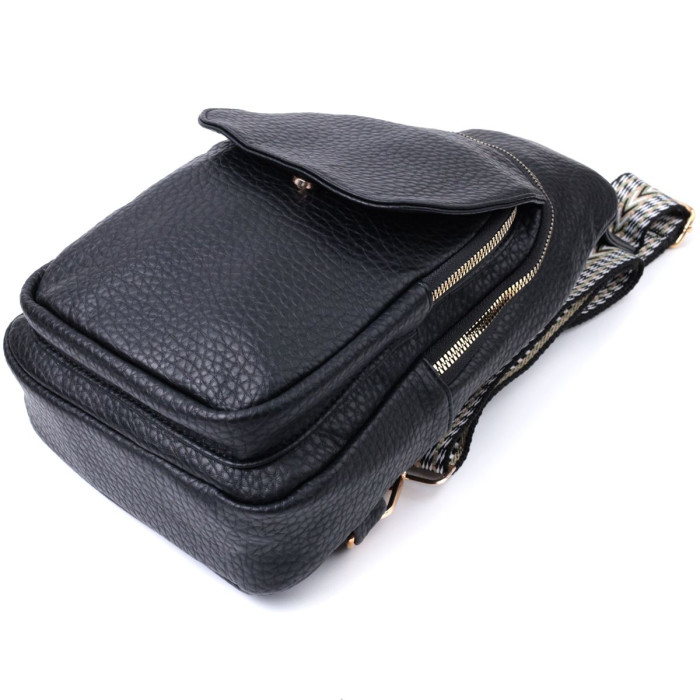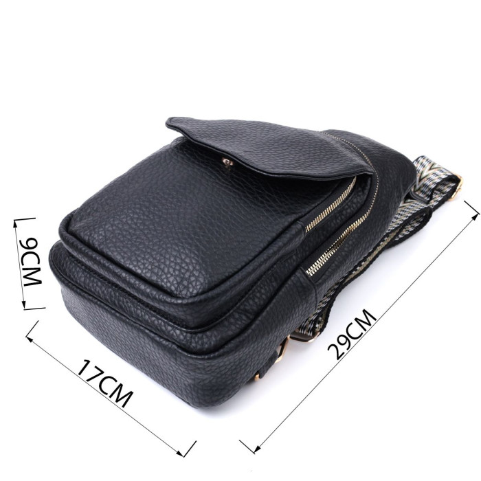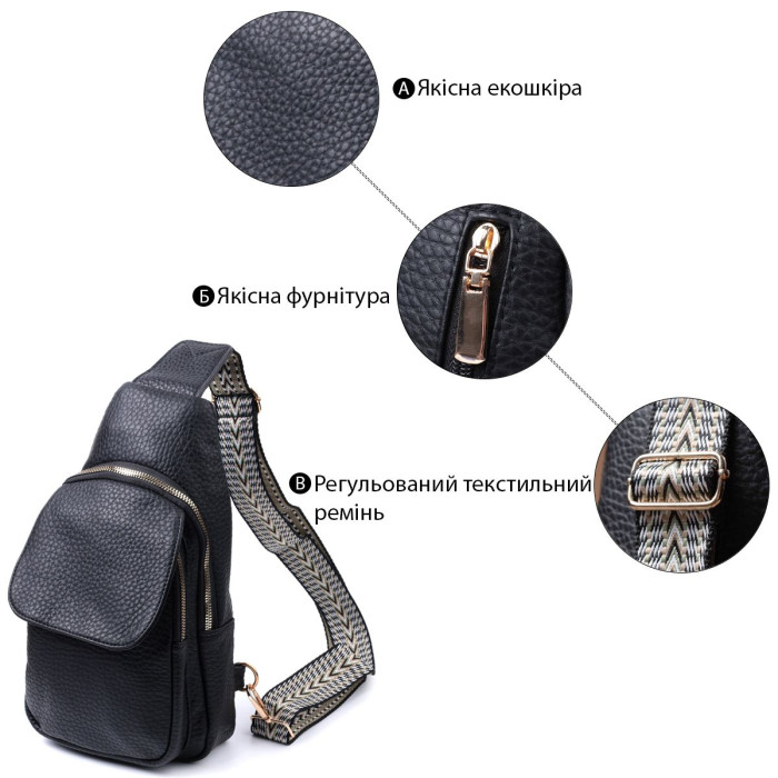 Зручна жіноча слінг сумка із зернистої екошкіри в цікавому чорному кольорі. Ця модель складається з одного основного відділення, яке закривається на блискавку і в якому знаходиться кишеня на блискавці і чотири кишені для кредитних карток усередині, а також двох кишень зовні та одного отвору для кабелю або навушників, що дуже зручно в сучасному світі. Акцентом даної моделі є зручний регульований плечовий ремінець у етнічному стилі, що дуже модно вже кілька сезонів. Екошкіра - високоякісна альтернатива натуральному матеріалу, яка дуже стійка до тертя, до низьких температур, відмінно носиться на відміну від інших штучних матеріалів, а також має гіпоалергенний склад на відміну від натуральної шкіри.