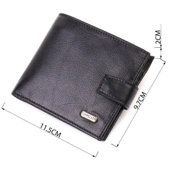 Універсальний чоловічий гаманець із натуральної гладкої шкіри. Аксесуар має основне відділення для купюр, три осередки для карток, дві кишені під сіточкою, кишеню на блискавці через усю довжину та монетницю, що закривається клапаном на кнопку. Гаманець складається навпіл і закривається хлястиком на кнопку. На лицьовій стороні в правому нижньому кутку розташований металевий логотип компанії виробника. Багатофункціональний чоловічий гаманець з дуже міцної шкіри чудовий вибір подарунка для солідного чоловіка.