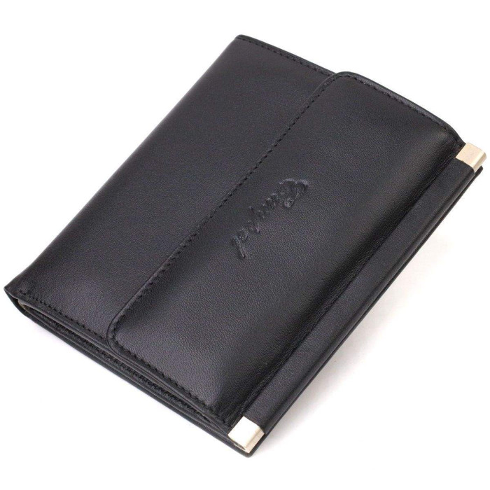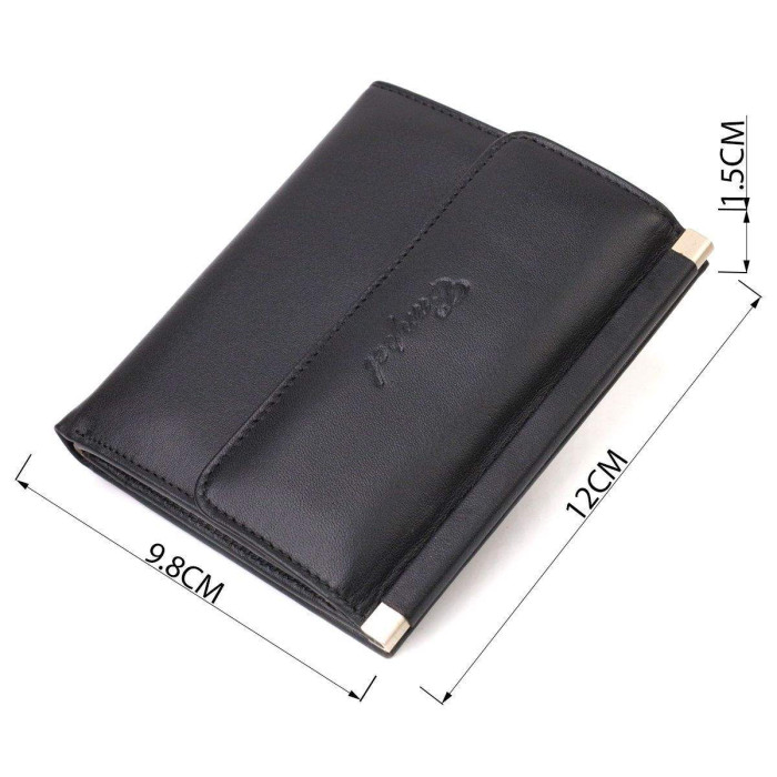 Стриманий жіночий гаманець середнього розміру із натуральної гладкої шкіри. Аксесуар має одне основне відділення з тканинною перегородкою в яке поміщаються купюри всіх номіналів, п'ять кишень для карток (одна під сіточкою), дві приховані кишені та монетницю. Закривається аксесуар навпіл на кнопку. Купуючи шкіряний аксесуар цієї фірми, собі або на подарунок, будьте певні, що він прослужить Вам не один рік.