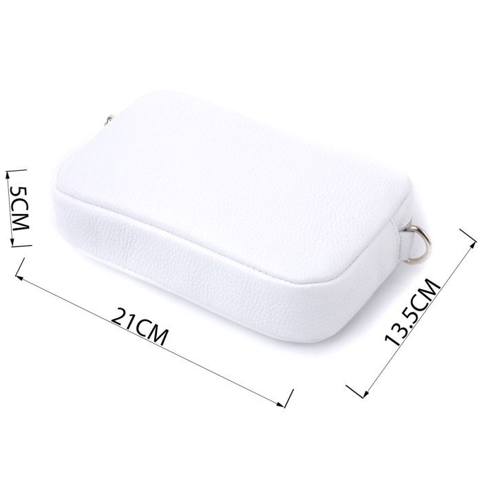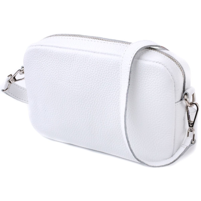 Стильна жіноча сумка, яку можна носити через плече як крос-боді, на плечі і як клатч в руках, для цього ремінець легко відстібається. Виріб виконаний у стильному білому кольорі із зернистої натуральної шкіри стійкою до подряпин. Шкіра м'яка, приємна на дотик із високими показниками зносостійкості. Відмінний варіант як кожного дня, так і на вечір. Сумка добре тримає форму, має міцну підкладку, фурнітура срібного кольору – стійка не змінює свій колір у процесі носіння. Аксесуар чудово поєднується з усіма стилями в одязі та може стати чудовим подарунком на будь-яке свято.