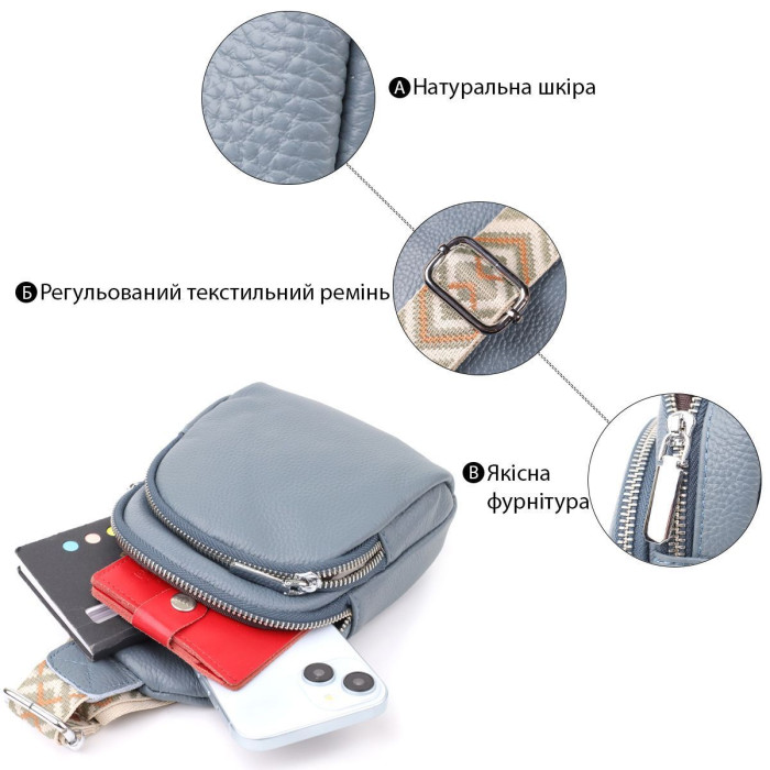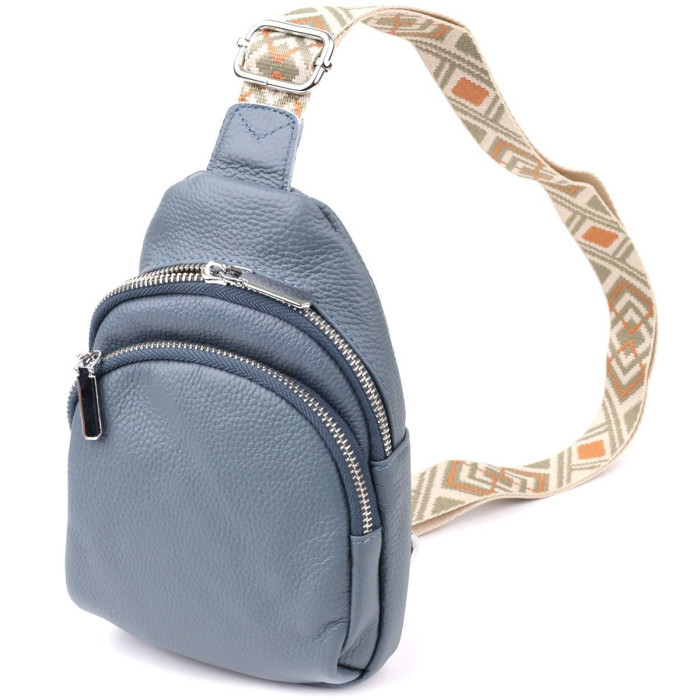 На особливу увагу заслуговує регульований текстильний ремінь з яскравим стильним візерунком - він не тільки забезпечує комфортну посадку на тілі, але і стає виразним елементом дизайну. Ремінь незнімний, але легко регулюється під ваше зростання і спосіб носіння. Фурнітура виконана в сріблястому кольорі, що надає аксесуару сучасний і стриманий блиск, який чудово поєднується з текстурою шкіри та акцентами ременя.