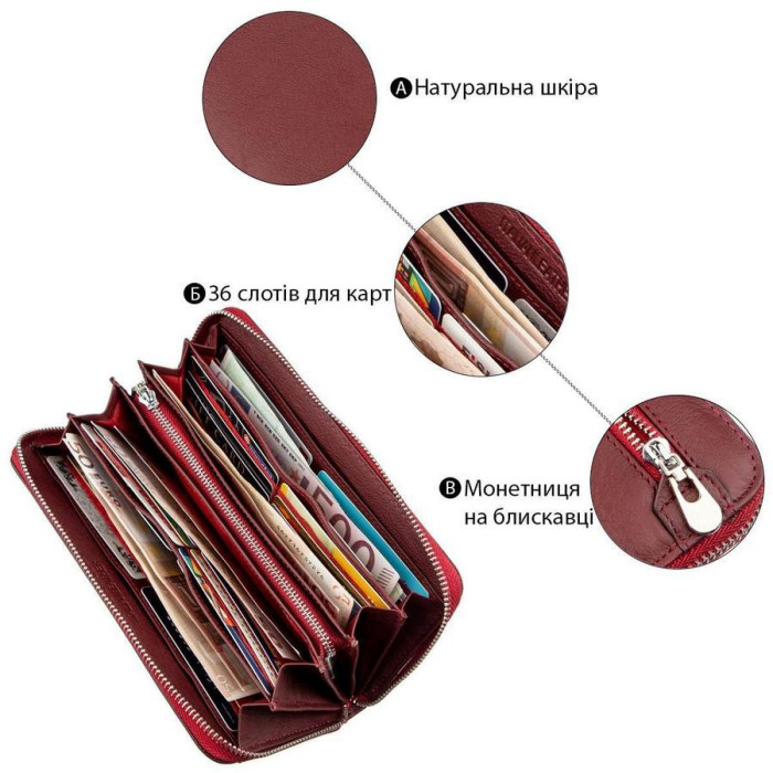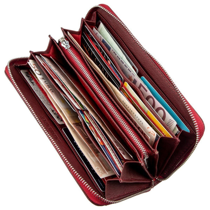 Чудовий жіночий клатч для розкішних і впевнених у собі особистостей. Зроблений з приємної і ніжної на дотик натуральної першокласної шкіри. Ну, а дивовижний червоний колір з нотками коричневого точно не залишить непоміченою господиню даного виробу. Якщо Ви не боїтеся стати центром уваги, то цей клатч саме для Вас! Наповнення даного гаманця представлено у вигляді відділень для купюр і кишень для візиток або пластикових карт, яких налічується аж тридцять шість. Також на зовнішній стороні клатчу є відділення на блискавці на всю висоту для монет або інших цінних дрібниць. Упакований гаманець в білу картонну коробку з логотипом виробника.