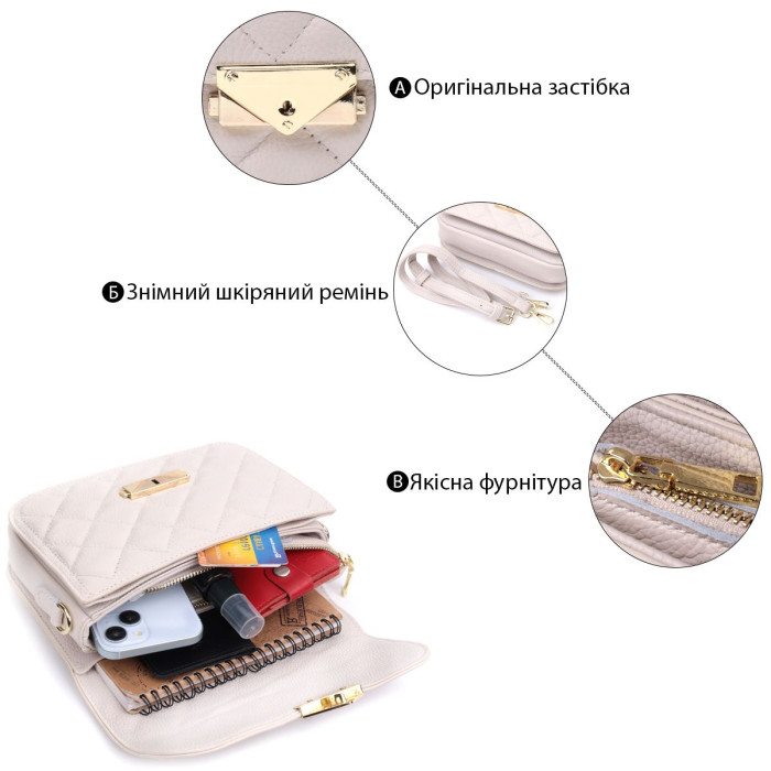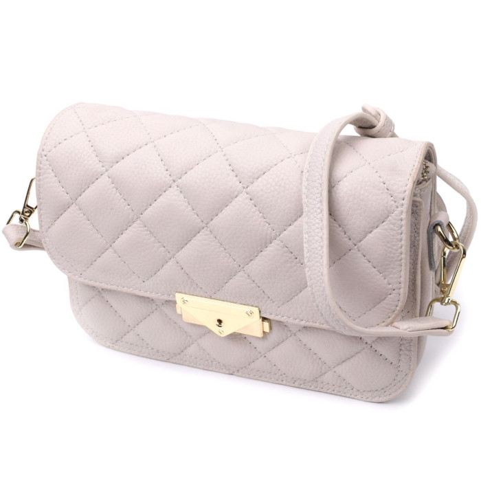 Стильна вечірня сумка для жінок з натуральної шкіри флотар, яка невибаглива у догляді та довго носиться. Виріб повністю прошито стильними ромбами, які ніколи не виходять з моди. Аксесуар складається з основного відділення, кишені відкритого типу та потайної кишені на блискавці всередині, а також чотирьох кишень під клапаном. Носити сумку можна в руці, під рукою, на плечі і через плече, для цього є шкіряний ремінь, що знімається. В аксесуарі використано якісну фурнітуру кольору жовтого золота. Універсальний варіант сумки на вечір та на кожен день.