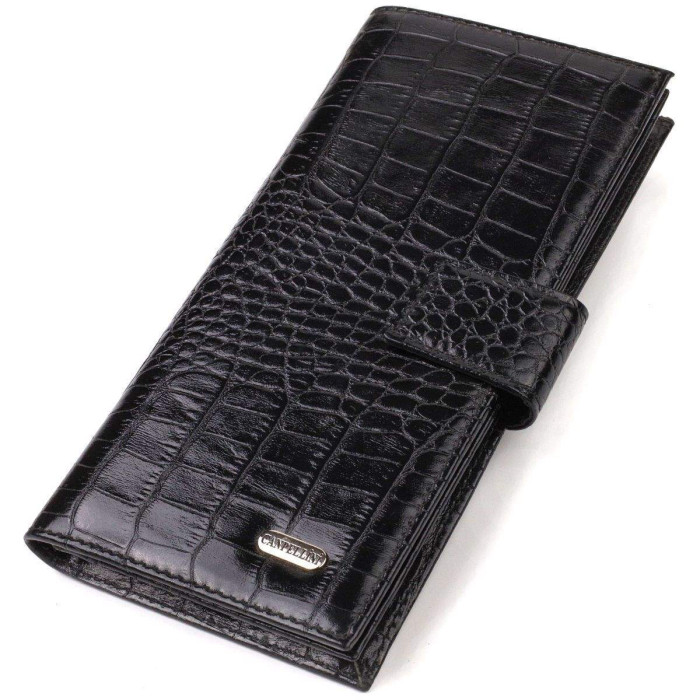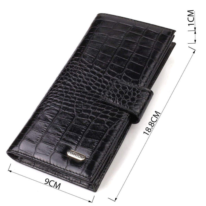 Сучасний чоловічий гаманець із натуральної фактурної шкіри із тисненням під крокодила. Аксесуар має одне основне відділення для купюр усіх номіналів, одинадцять осередків для карток, кишеню під сіточкою для пропуску та дві приховані кишені. Закривається аксесуар навпіл хлястиком на кнопку. На лицьовій стороні, у правому нижньому куті металевий логотип компанії виробника. Купуючи шкіряний аксесуар цієї фірми, собі або на подарунок, будьте певні, що він прослужить Вам не один рік.