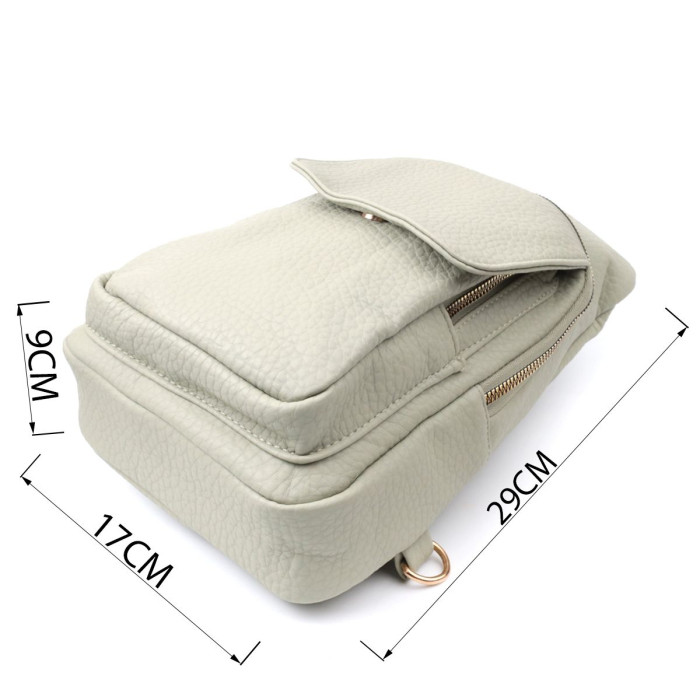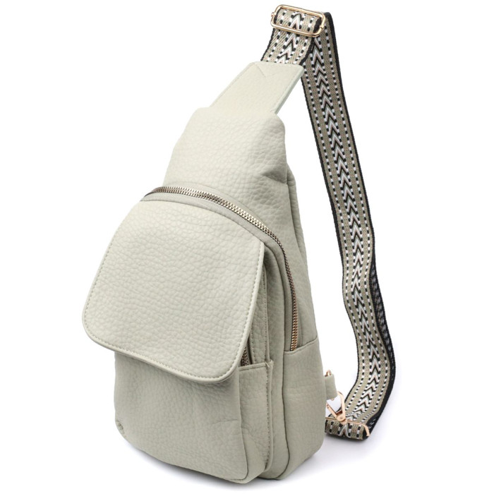 Модна жіноча слінг сумка з зернистої екошкіри в унікальному кольорі фісташки. Ця модель складається з одного основного відділення, яке закривається на блискавку і в якому знаходиться кишеня на блискавці і чотири кишені для кредитних карток усередині, а також двох кишень зовні та одного отвору для кабелю або навушників, що дуже зручно в сучасному світі. Акцентом даної моделі є зручний регульований плечовий ремінець у етнічному стилі, що дуже модно вже кілька сезонів. Екошкіра - високоякісна альтернатива натуральному матеріалу, яка дуже стійка до тертя, до низьких температур, відмінно носиться на відміну від інших штучних матеріалів, а також має гіпоалергенний склад на відміну від натуральної шкіри.