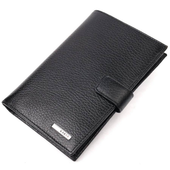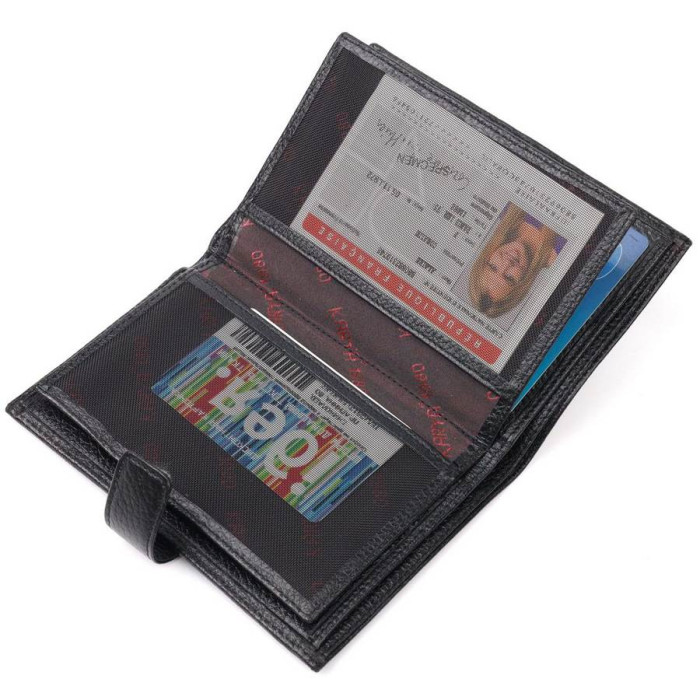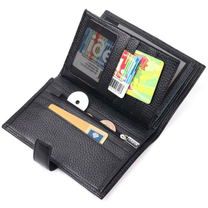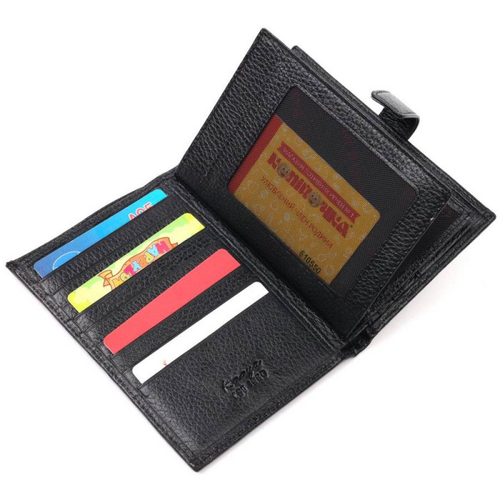 Класичний чоловічий гаманець із натуральної шкіри, в чорному кольорі. Модель вертикального типу складається навпіл і закривається хлястиком на кнопку. Короткий дизайн, відмінно лягає в руку, поміщається в будь-яку сумку. Аксесуар упакований у фірмову коробочку. Вироби з натуральної шкіри завжди будуть чудовим подарунком для близької людини.
