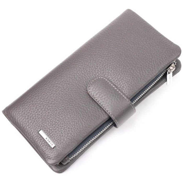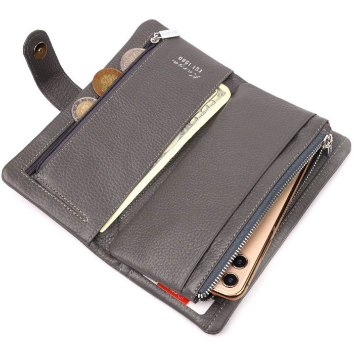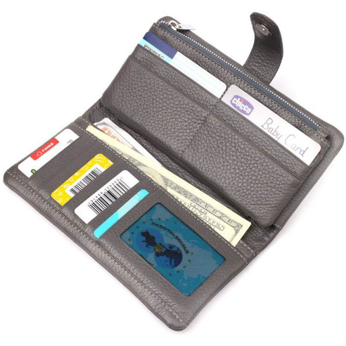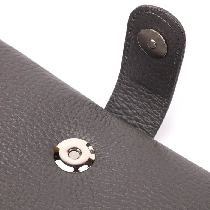 Вертикальний жіночий гаманець з натуральної зернистої шкіри, в сірому кольорі. Внутрішній розворот складається з чотирьох відкритих відділень для купюр, однієї кишені з розширювачем на застібці, однієї прихованої кишені на блискавці, однієї кишені-перегородки на блискавці, однієї сітчастої кишеньки та дванадцяти секцій для пластикових карток. Складається аксесуар навпіл, з фіксацією на хлястик із магнітом. Такий гаманець з натуральної шкіри – це ідеальний варіант на кожен день для тих, хто цінує якість, зручність та комфорт.
