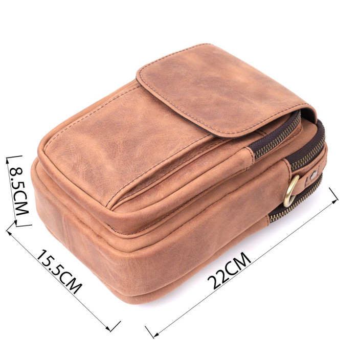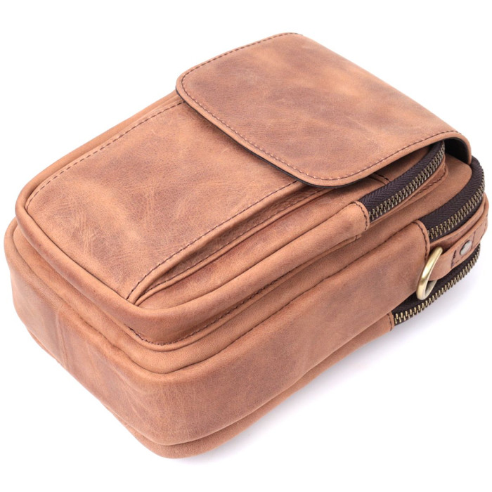 Компактна чоловіча сумка із натуральної вінтажної шкіри. По краях аксесуар прошитий коричневою ниткою. Всі шви рівні, ниток, що стирчать, немає. Всередині аксесуара щільна текстильна підкладка коричневого кольору. Модель дуже зручна, її можна носити в руках, для цього є шкіряна ручка, а також на плечі в комплекті є регульований зйомний текстильний ремінь. Модель доповнена якісною фурнітурою мідного кольору. Сумка буде ідеальним варіантом на кожен день.