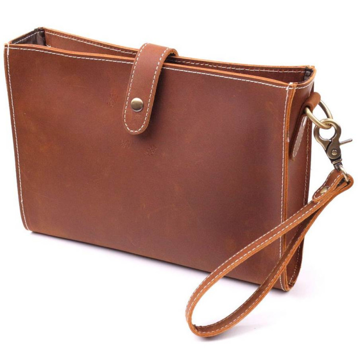Дуже красива і зручна сумка жіноча з натуральної вінтажної шкіри. Сумка дуже стильна, має одне велике відділення, і чотири кишеньки різних розмірів. Носити аксесуар можна в руках, як клатч, а також на плечі, для чого є текстильно-шкіряний ремінь, що знімається. Закривається сумка на блискавку і хлястик з магнітом зверху, по краю сумка прошита рівним рядком білого кольору. Колір металевої фурнітури жовтий. Чудова шкіряна сумка - чудовий варіант для подарунка близьким та рідним людям.