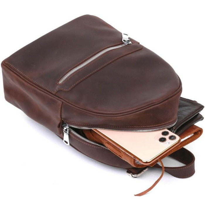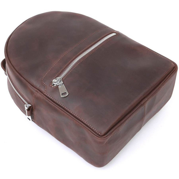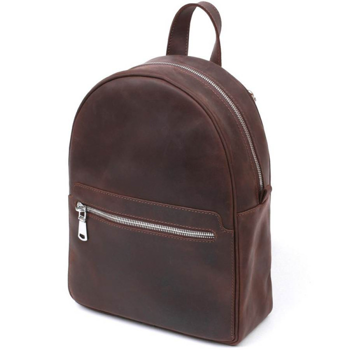 Невеликий жіночий рюкзак у стильному акуратному дизайні від українського виробника. Матеріал виготовлення – щільна натуральна шкіра високої якості із підвищеною міцністю. Усередині є одне просторе відділення і дві кишені, у тому числі одна на блискавці. На зовнішній стороні також є невелика кишеня, що дуже зручно. Колір – насичений коричневий.