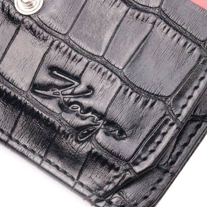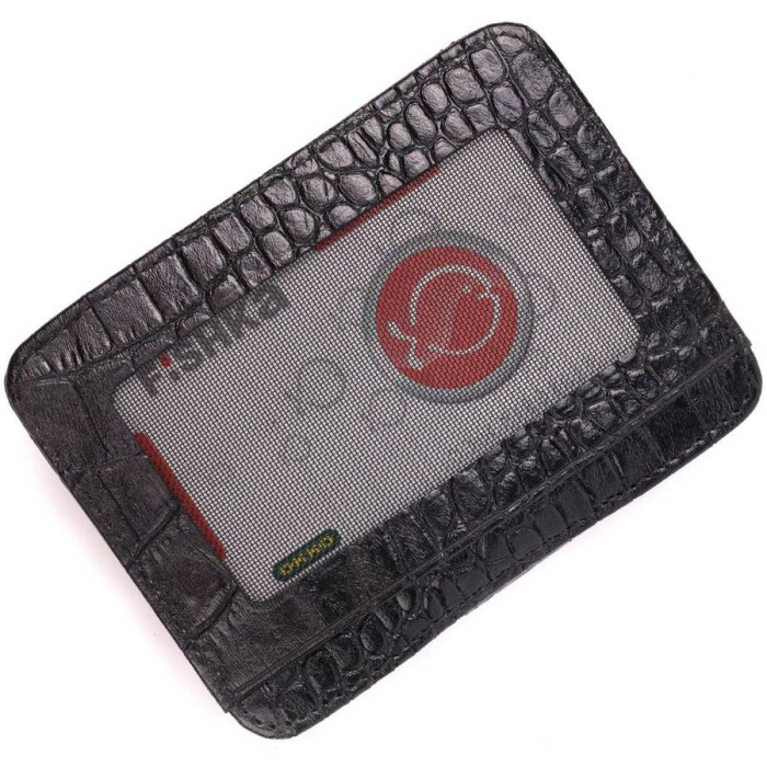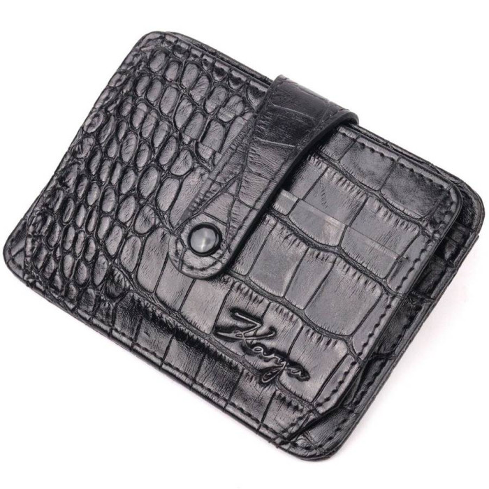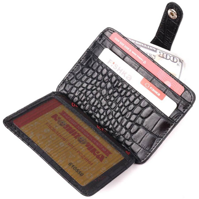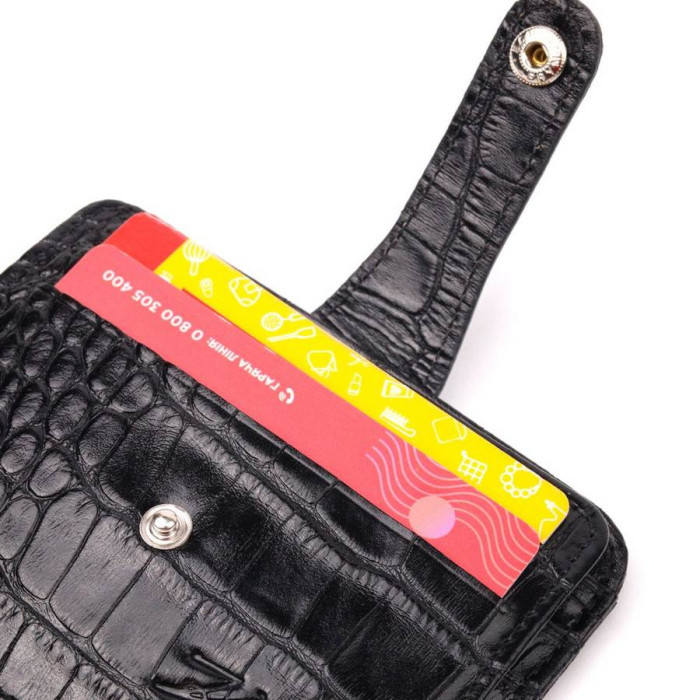 Практичний картхолдер із натуральної шкіри з тисненням під крокодила, у класичному чорному кольорі. При закритті розворот фіксується на хлястик з кнопкою. Аксесуар упакований у фірмову коробочку. Вироби з натуральної шкіри завжди будуть чудовим подарунком для близької людини.