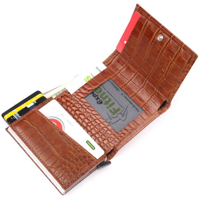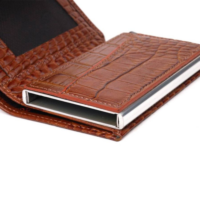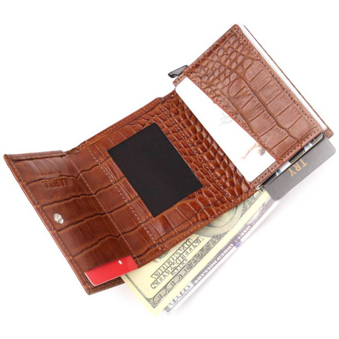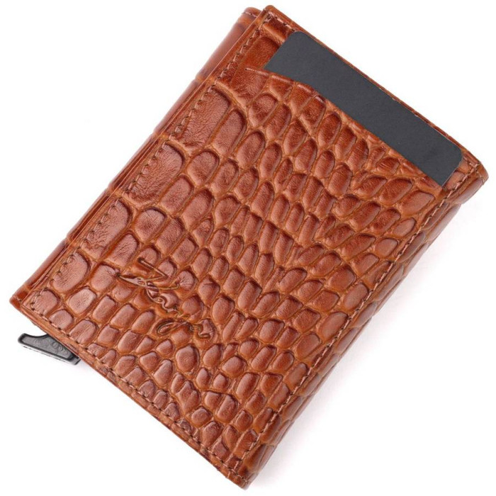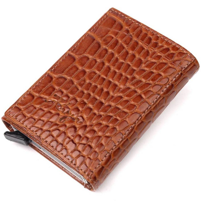 Відмінний картхолдер коричневого кольору з натуральної шкіри, з тисненням під крокодила, призначений для зберігання банківських та дисконтних карток та невеликої кількості готівки. Має лаконічний дизайн, відмінно лягає в руку, поміщається в кишеню, а також будь-яку сумку. Шкіра м'яка, приємна на дотик. Механізм працює надійно та зручний у використанні; картки добре закріплені в аксесуарі. Відмінна ідея для подарунка близькій людині.