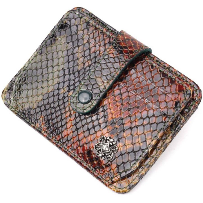 Незвичайний картхолдер із лакованої шкіри з тисненням під рептилію. При закритті розворот фіксується на хлястик з кнопкою. На лицьовій стороні у вигляді декору розташований металевий логотип виробника. Аксесуар упакований у фірмову коробочку. Вироби з натуральної шкіри завжди будуть чудовим подарунком для близької людини.
