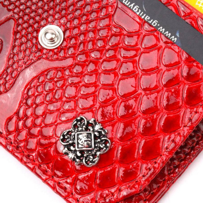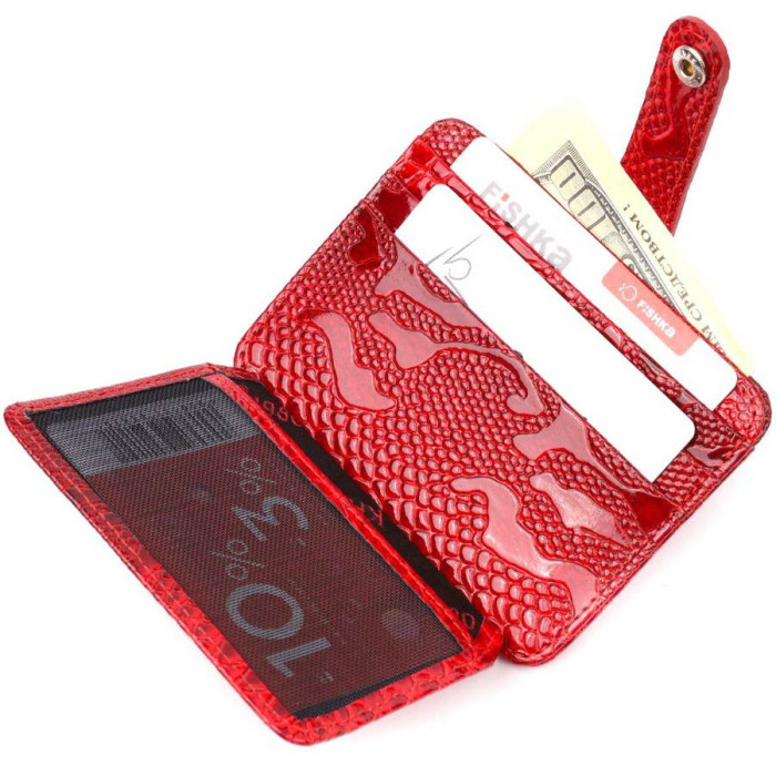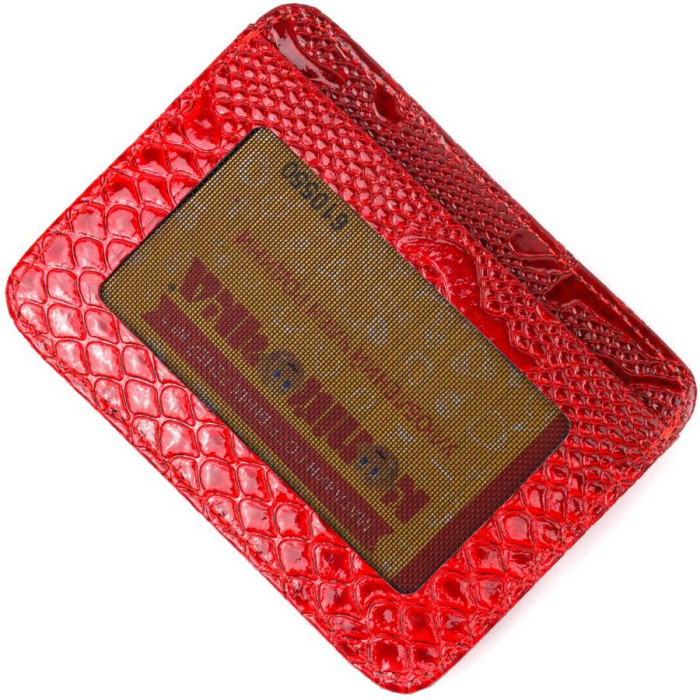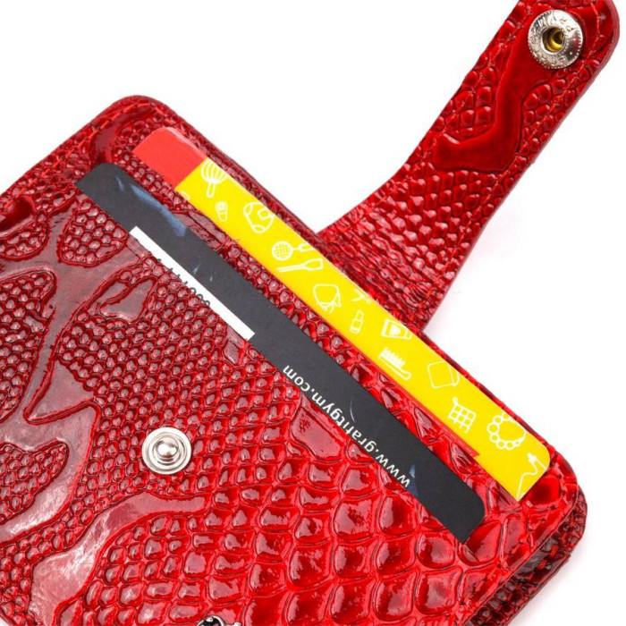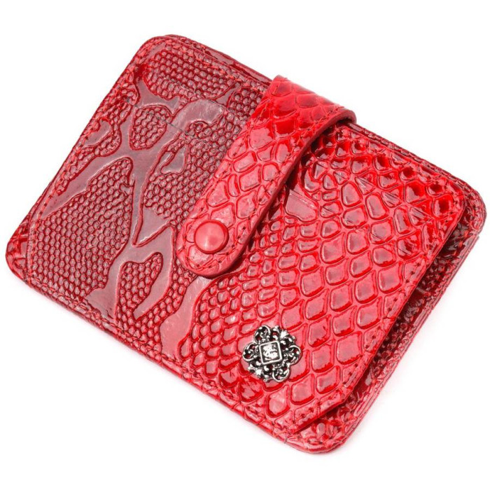 Яскравий картхолдер із лакованої шкіри з тисненням під рептилію, у червоному кольорі. При закритті розворот фіксується на хлястик з кнопкою. На лицьовій стороні у вигляді декору розташований металевий логотип виробника. Аксесуар упакований у фірмову коробочку. Вироби з натуральної шкіри завжди будуть чудовим подарунком для близької людини.