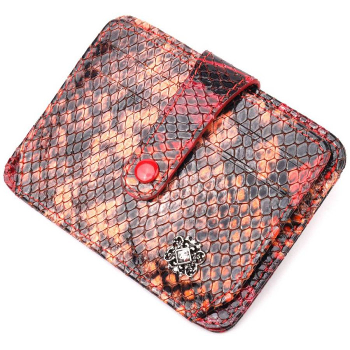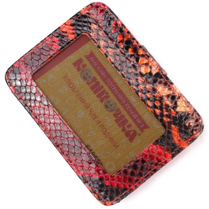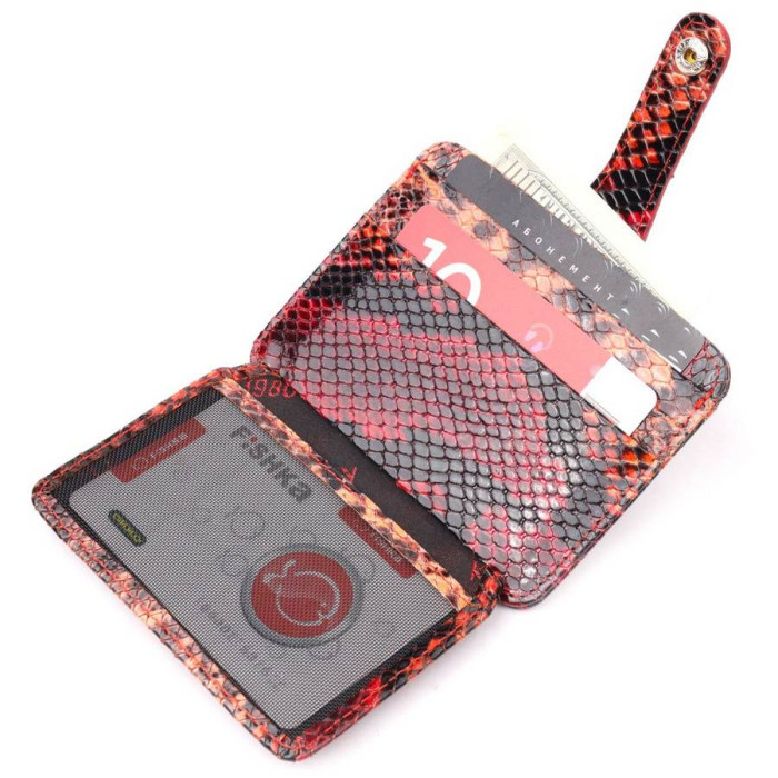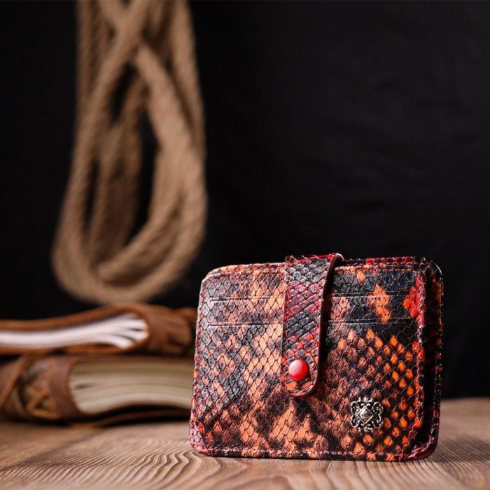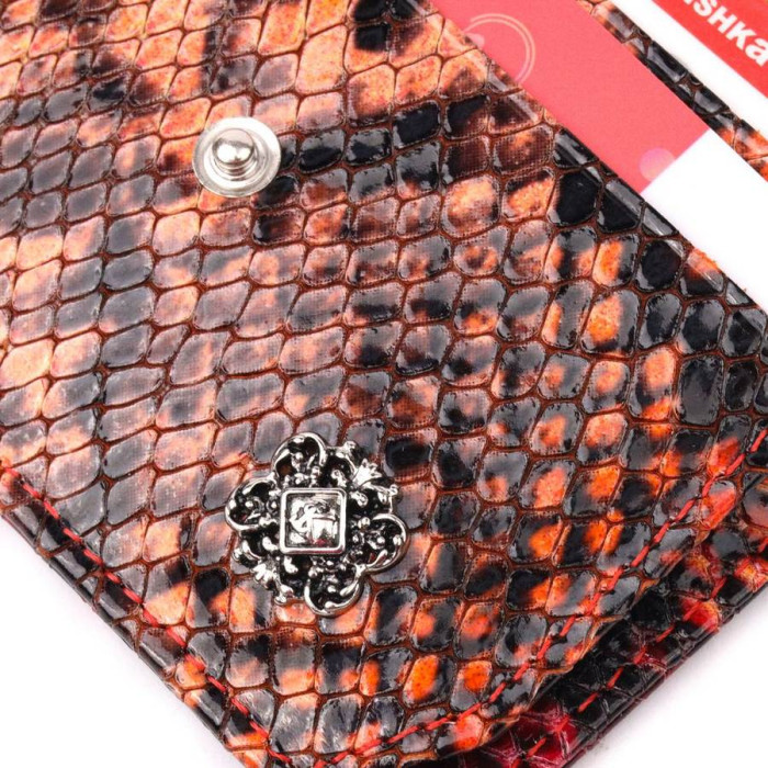 Стильний картхолдер із лакованої шкіри, з тисненням під змію. При закритті розворот фіксується на хлястик з кнопкою. На лицьовій стороні у вигляді декору розташований металевий логотип виробника. Аксесуар упакований у фірмову коробочку. Вироби з натуральної шкіри завжди будуть чудовим подарунком для близької людини.