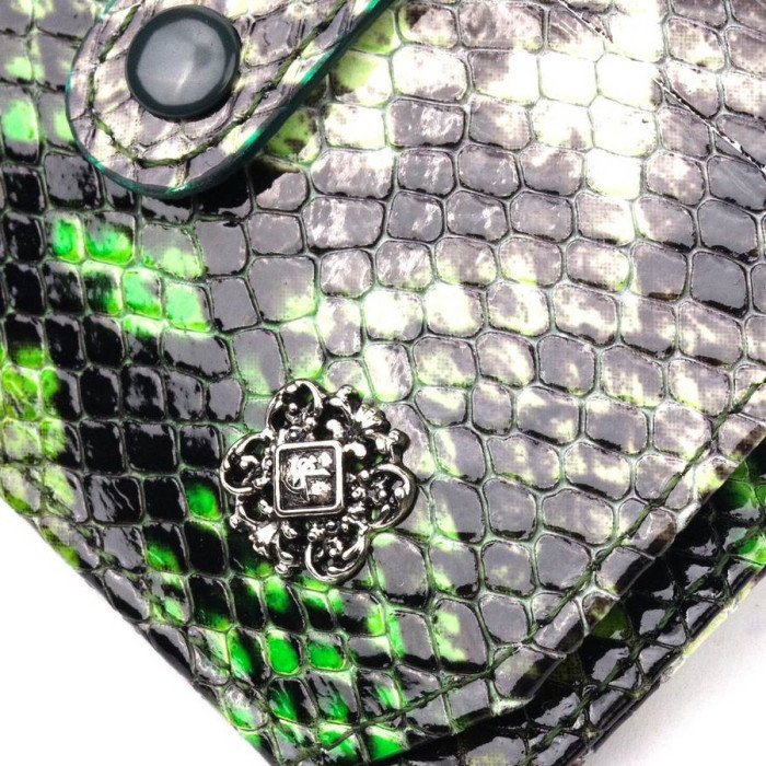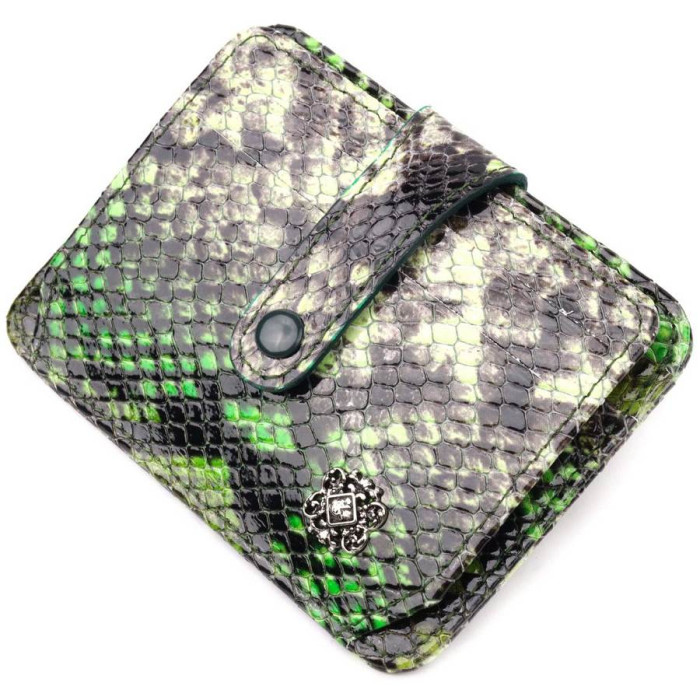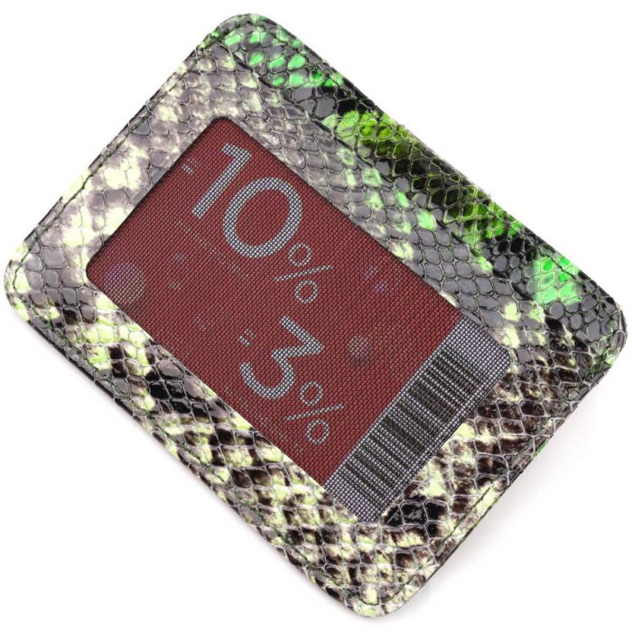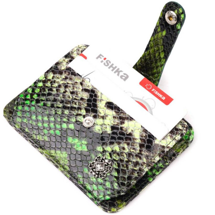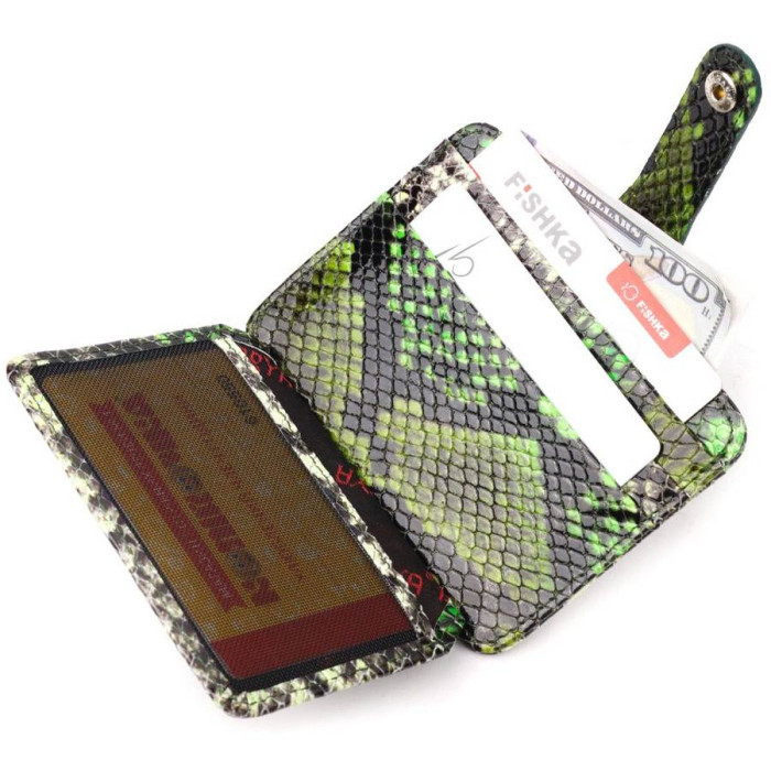 Стильний картхолдер із лакованої шкіри, з тисненням під змію, у красивому зеленому кольорі. При закритті розворот фіксується на хлястик з кнопкою. На лицьовій стороні у вигляді декору розташований металевий логотип виробника. Аксесуар упакований у фірмову коробочку. Вироби з натуральної шкіри завжди будуть чудовим подарунком для близької людини.