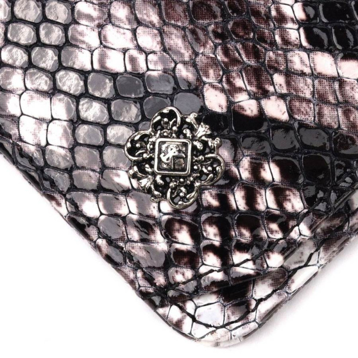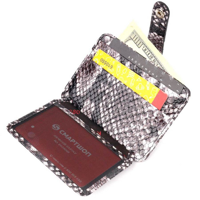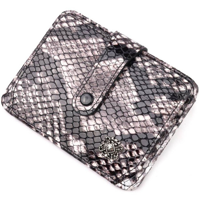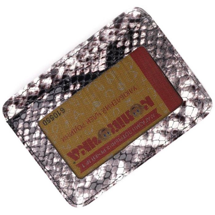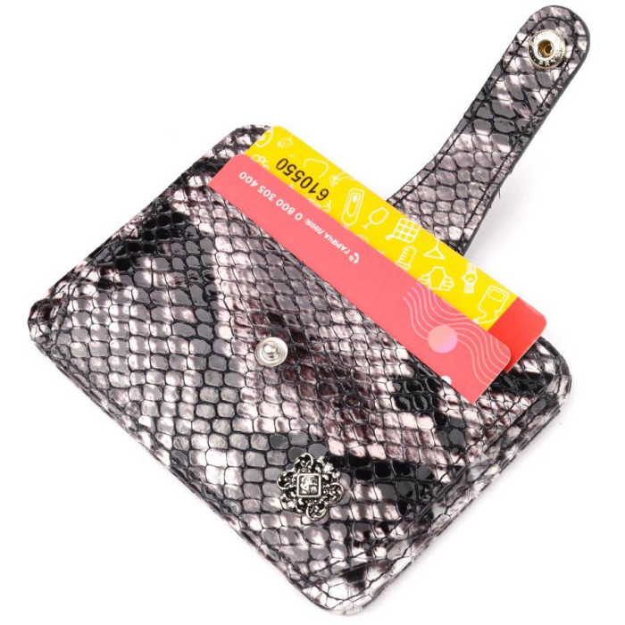 Гарний картхолдер із лакованої шкіри, з тисненням під змію. При закритті розворот фіксується на хлястик з кнопкою. На лицьовій стороні у вигляді декору розташований металевий логотип виробника. Аксесуар упакований у фірмову коробочку. Вироби з натуральної шкіри завжди будуть чудовим подарунком для близької людини.