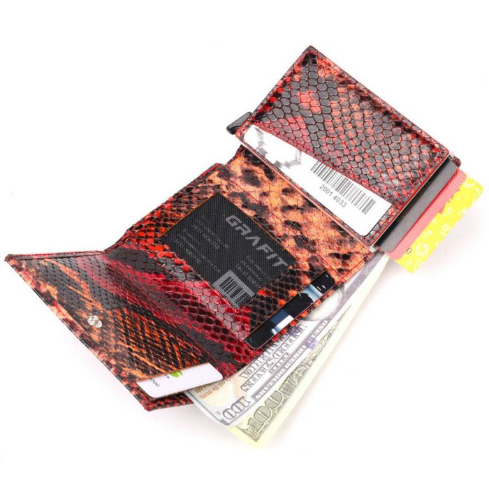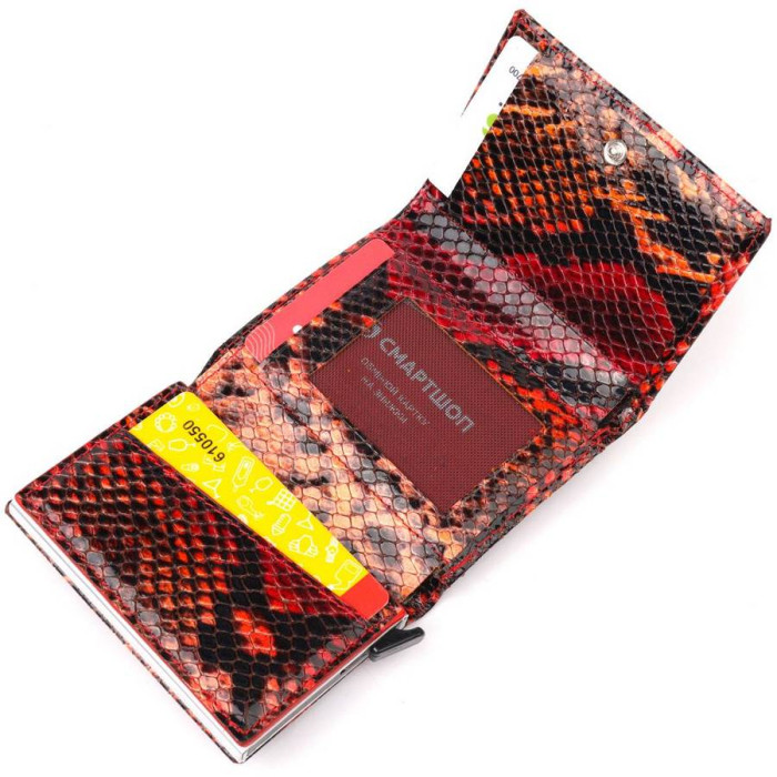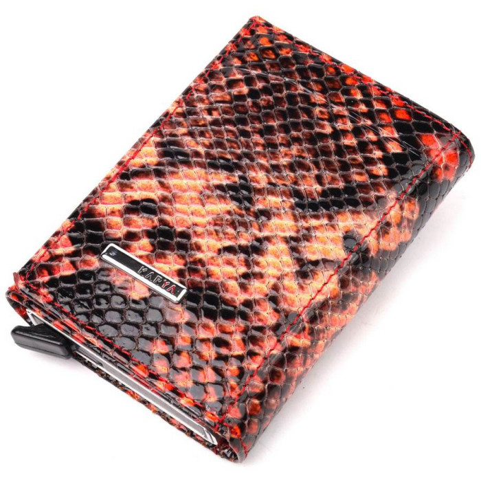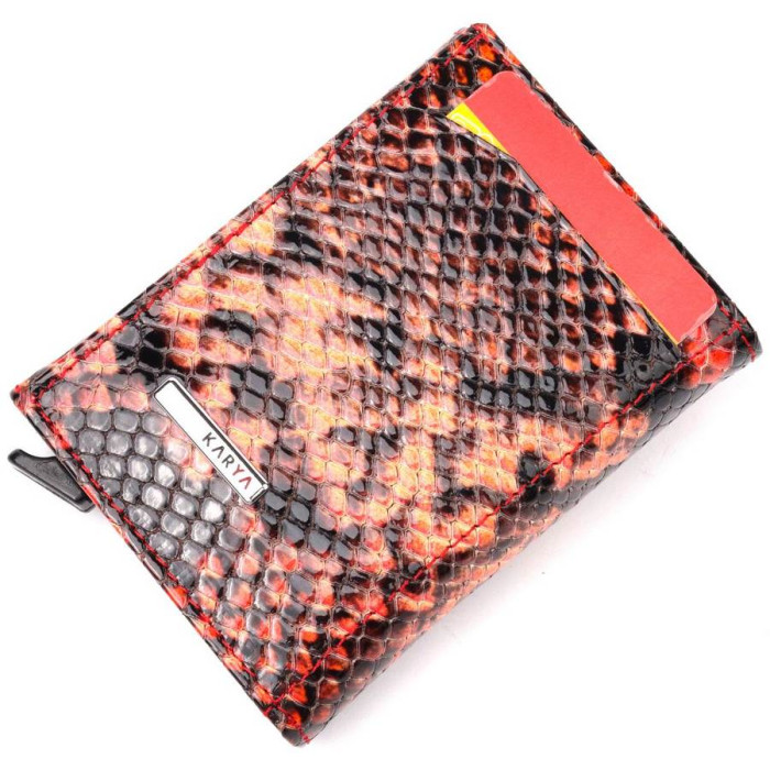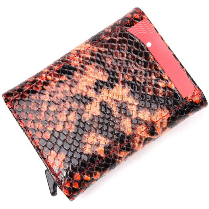 Яскравий картхолдер з лакованої шкіри, з тисненням під змію, призначений для зберігання банківських та дисконтних карток та невеликої кількості готівки. Має лаконічний дизайн, відмінно лягає в руку, поміщається в кишеню, а також будь-яку сумку. Шкіра м'яка, приємна на дотик. Механізм працює надійно та зручний у використанні; картки добре закріплені в аксесуарі. Відмінна ідея для подарунка близькій людині.