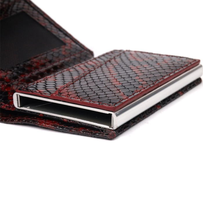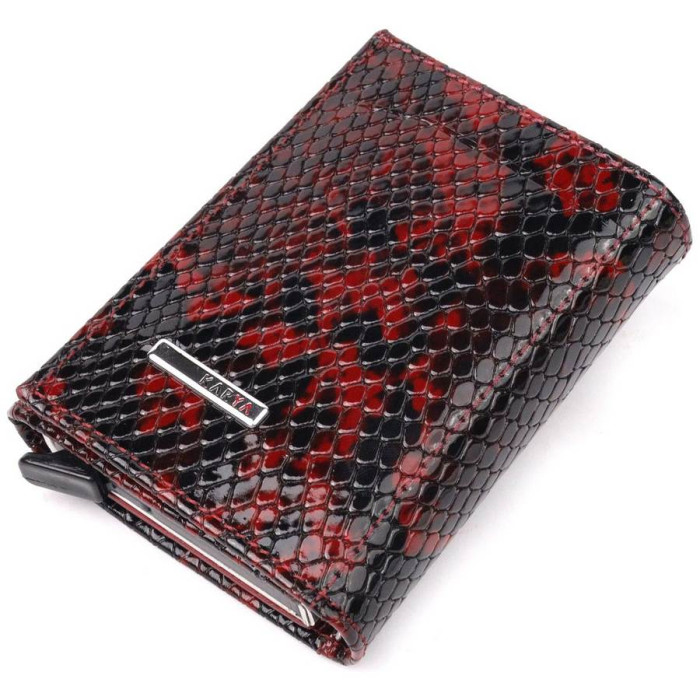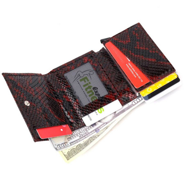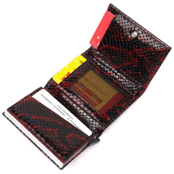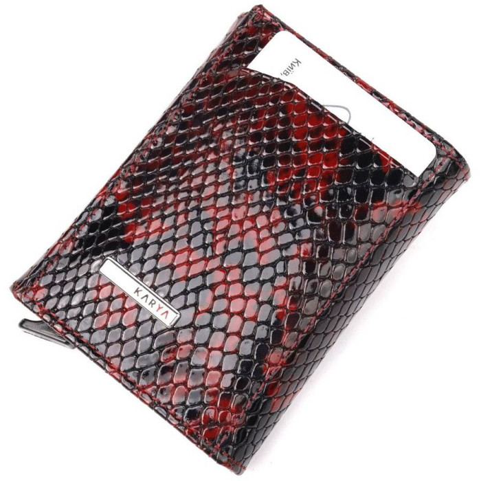 Стильний картхолдер з лакованої шкіри, з тисненням під змію, призначений для зберігання банківських та дисконтних карток та невеликої кількості готівки. Має лаконічний дизайн, відмінно лягає в руку, поміщається в кишеню, а також будь-яку сумку. Шкіра м'яка, приємна на дотик. Механізм працює надійно та зручний у використанні; картки добре закріплені в аксесуарі. Відмінна ідея для подарунка близькій людині.