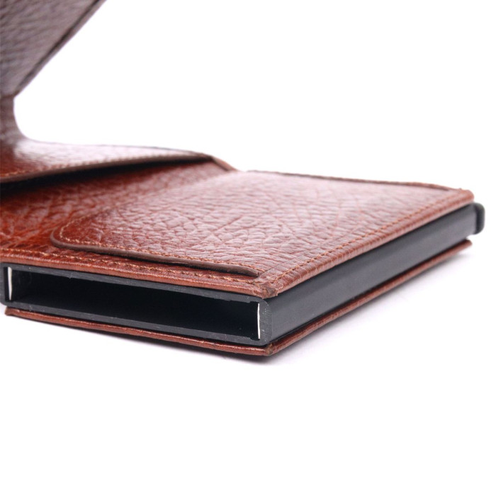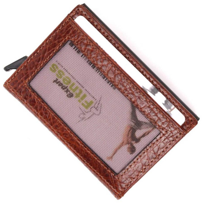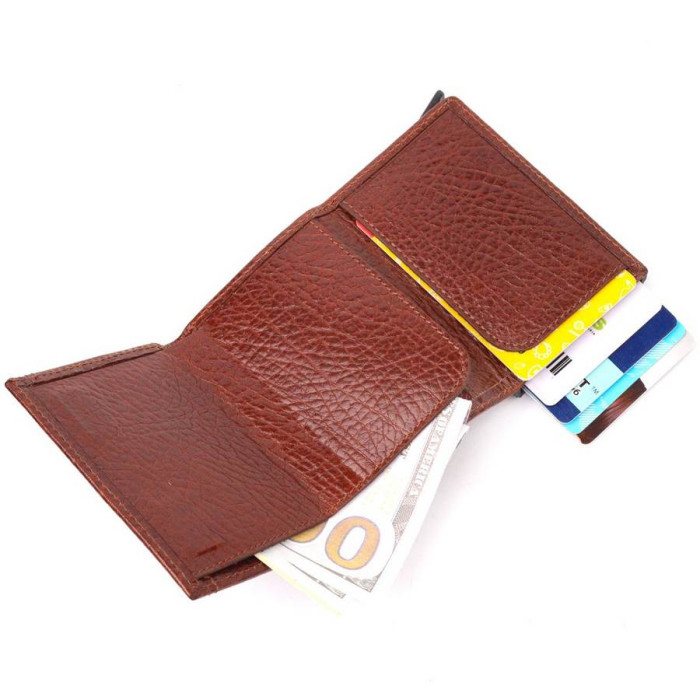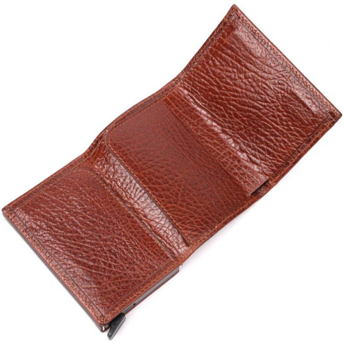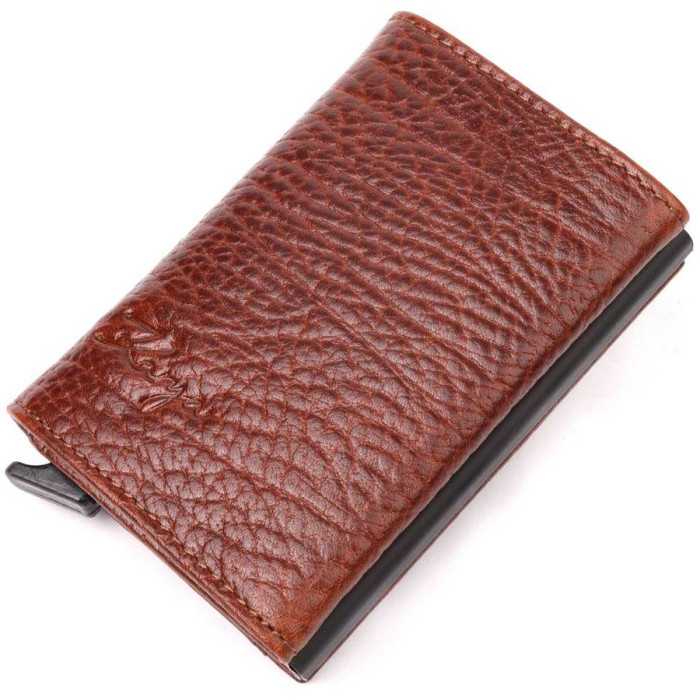 Практичний картхолдер з натуральної шкіри, призначений для зберігання банківських та дисконтних карток та невеликої кількості готівки. Має лаконічний дизайн, відмінно лягає в руку, поміщається в кишеню, а також будь-яку сумку. Шкіра м'яка, приємна на дотик. Механізм працює надійно та зручний у використанні; картки добре закріплені в аксесуарі. Відмінна ідея для подарунка близькій людині.
