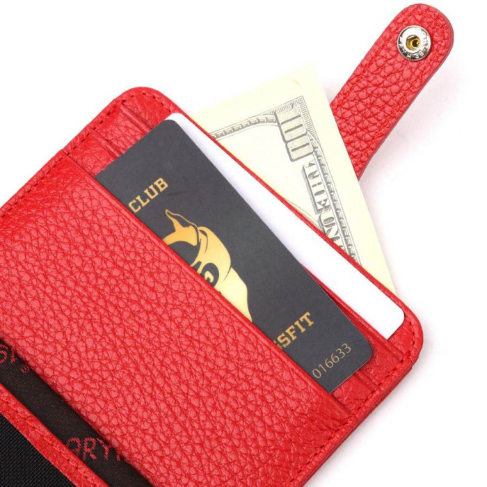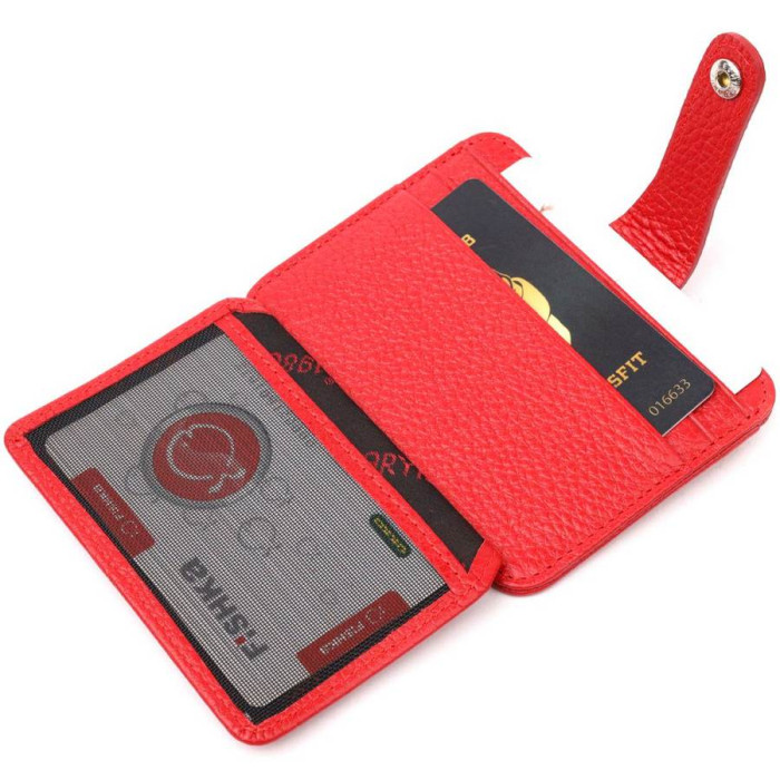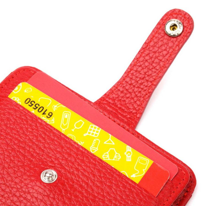 Гарний картхолдер із якісної натуральної шкіри, в червоному кольорі. При закритті розворот фіксується на хлястик з кнопкою. Аксесуар упакований у фірмову коробочку. Вироби з натуральної шкіри завжди будуть чудовим подарунком для близької людини.