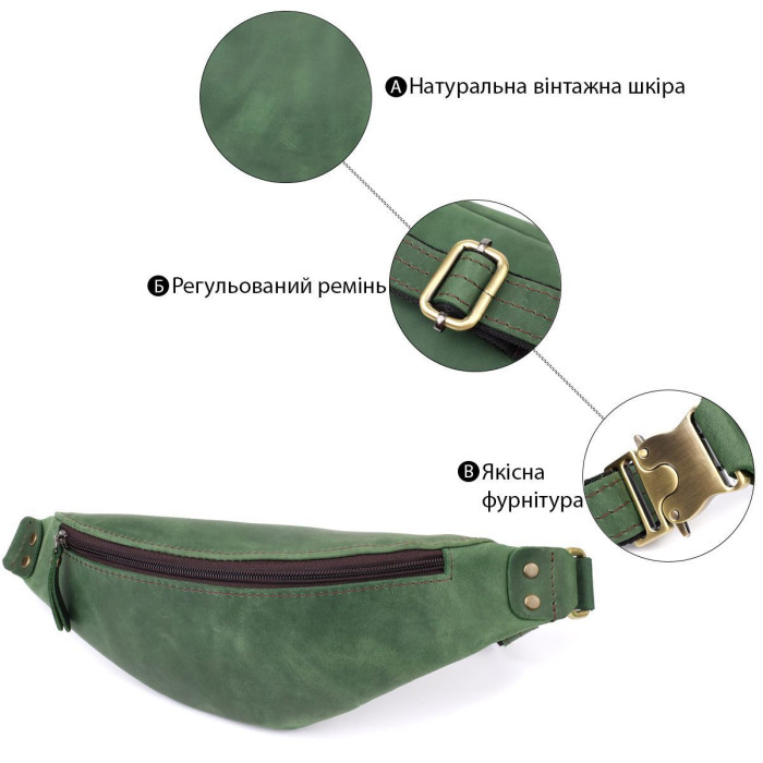 Сумка-бананка Shvigel із вінтажної шкіри у насиченому зеленому кольорі. Ця чоловіча бананка від українського бренду Shvigel виконана з натуральної вінтажної шкіри та виділяється ефектним глибоким зеленим відтінком, який підкреслює унікальність виробу та робить образ виразнішим. Така сумка не тільки зручна у повсякденному використанні, а й стає стильним акцентом завдяки нестандартному кольору.