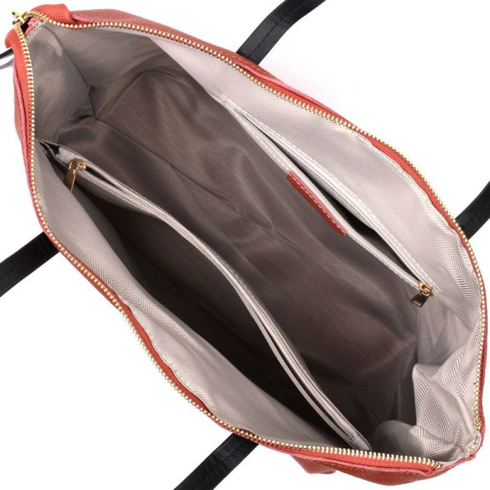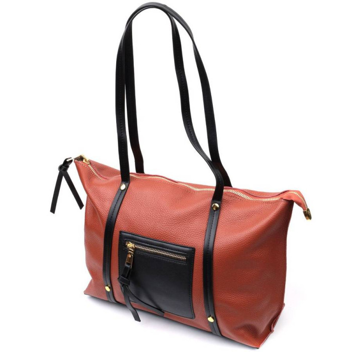 Жіноча містка сумка, у поєднанні двох кольорів коричневого та чорного. Пошито виріб з натуральної шкіри флотар, яка невибаглива у догляді та довго носиться. Аксесуар складається з двох відділень та трьох кишень на блискавках різної величини. Носити сумку можна на плечі та в руках, для цього є подовжені шкіряні ручки. В аксесуарі використано якісну фурнітуру кольору жовтого золота.
