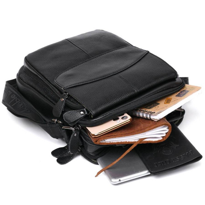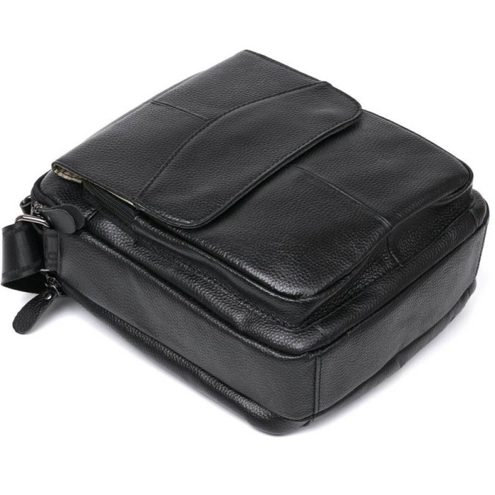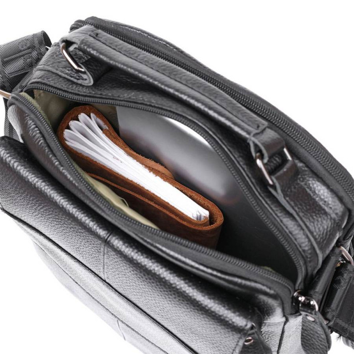 Містка сумка стандартного розміру з натуральної високоміцної шкіри. Має універсальний чорний колір та зернисту фактуру. Дана модель відмінно підійде тим, кому важливо розмістити весь вміст по окремих кишенях та відділеннях. Сумку можна носити як у руці, так і через плече. Ремінь незнімний, але регулюється за довжиною.