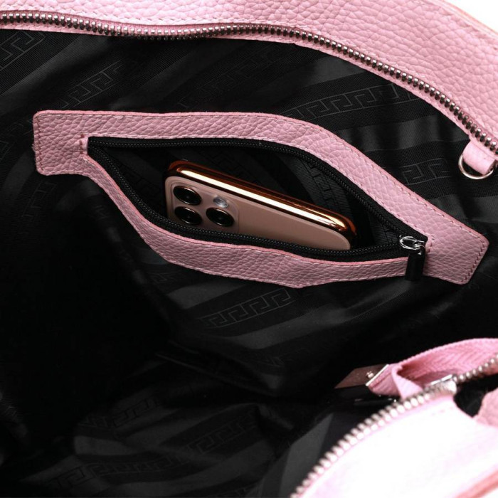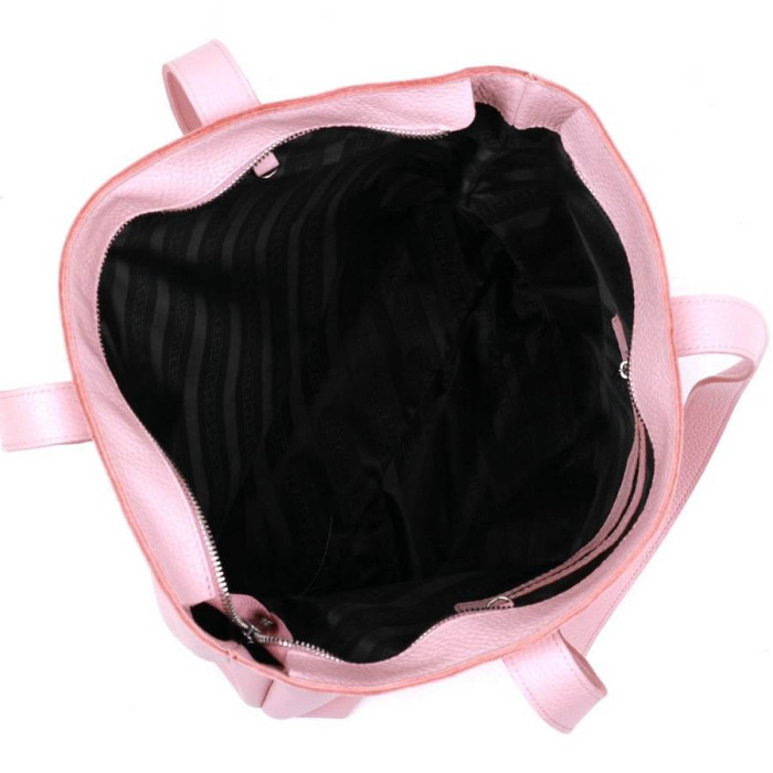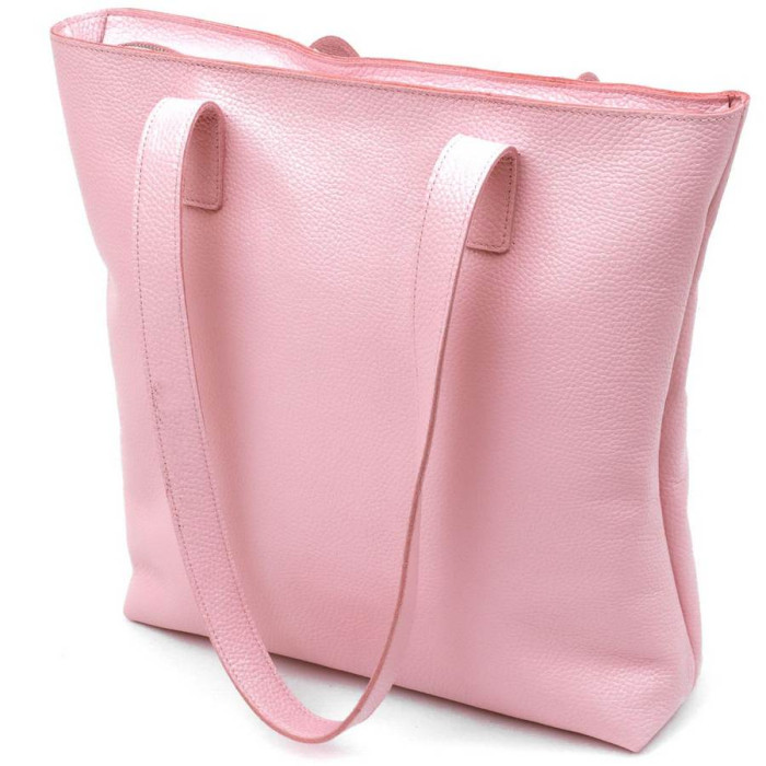 Відмінна жіноча сумка-шоппер стандартного розміру у сучасному дизайні. Матеріал виготовлення – натуральна шкіра високого класу з високими показниками міцності та стійкості до зношування. Колір цієї моделі - блідо-рожевий, що виглядає дуже ніжно і красиво, фактура - зерниста. Основне відділення закривається на блискавку, на зовнішній стороні є невелика кишенька.