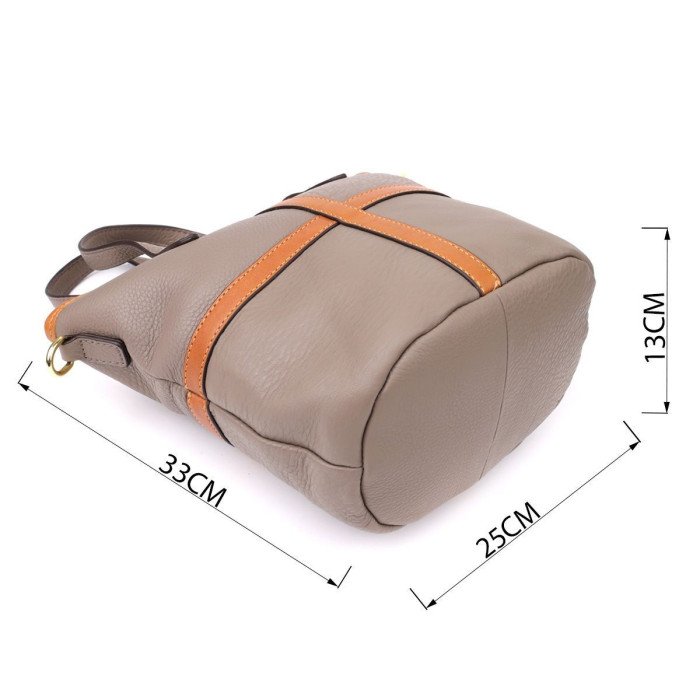 Тверде дно допомагає сумці зберігати форму та надає їй стійкості. Фурнітура кольору жовтого золота ефектно контрастує зі шляхетним сірим відтінком шкіри, додаючи аксесуару витонченості.