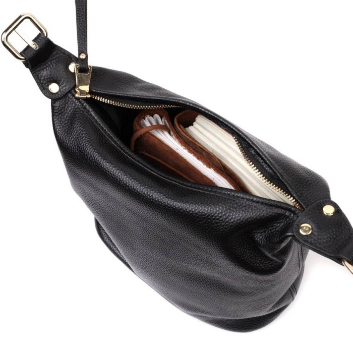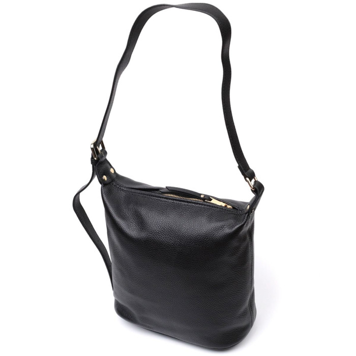 Вертикальна стильна сумка для жінок із твердим дном із натуральної м'якої шкіри, яка дуже добре показала себе в експлуатації. Аксесуар складається з основного відділення, потайної кишені на блискавці та кишені відкритого типу. Носити сумку можна на плечі та через плече, для цього є шкіряний незнімний регульований ремінь. У виробі використано якісну фурнітуру кольору жовтого золота. Чудовий варіант сумки на кожен день.