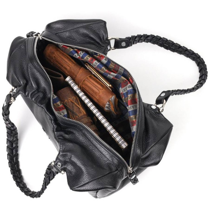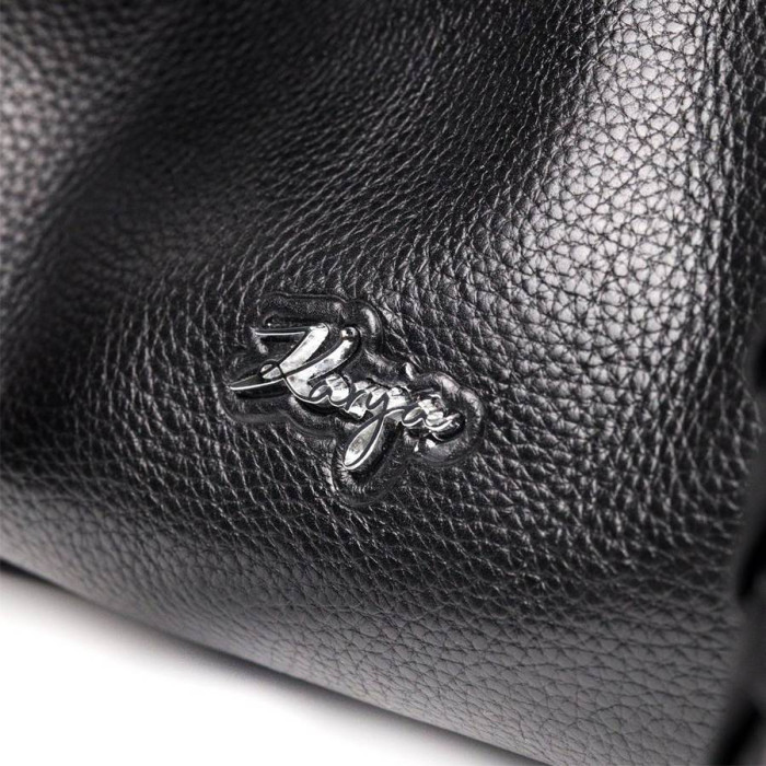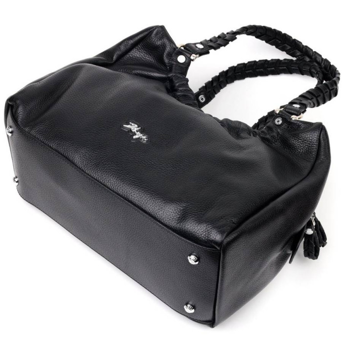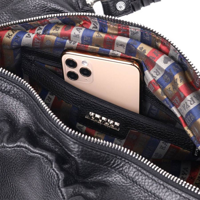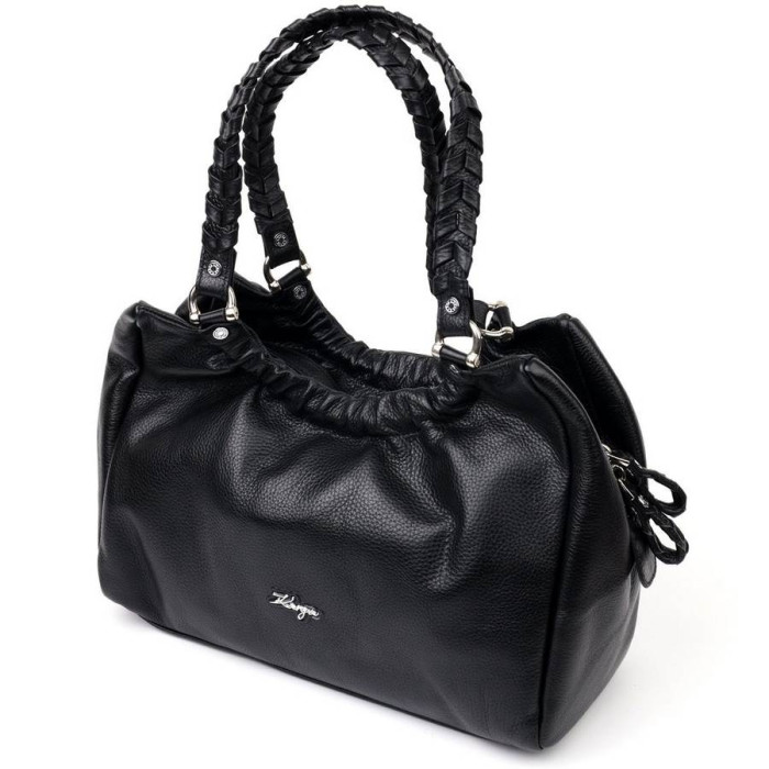 Містка сумка жіноча з натуральної зернистої шкіри, класичного чорного кольору. Сумка функціональна та зручна в експлуатації, якісна фурнітура сріблястого кольору не тільки доповнює стильний дизайн сумки, але й захищає виріб. Аксесуар упакований у фірмовий текстильний мішок Karya. Сумка з натуральної шкіри завжди буде чудовим подарунком будь-якій жінці.