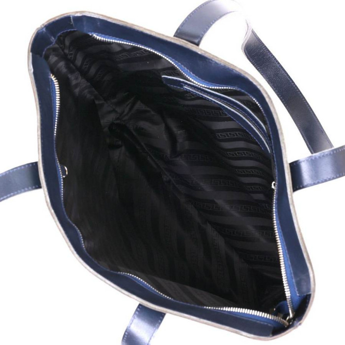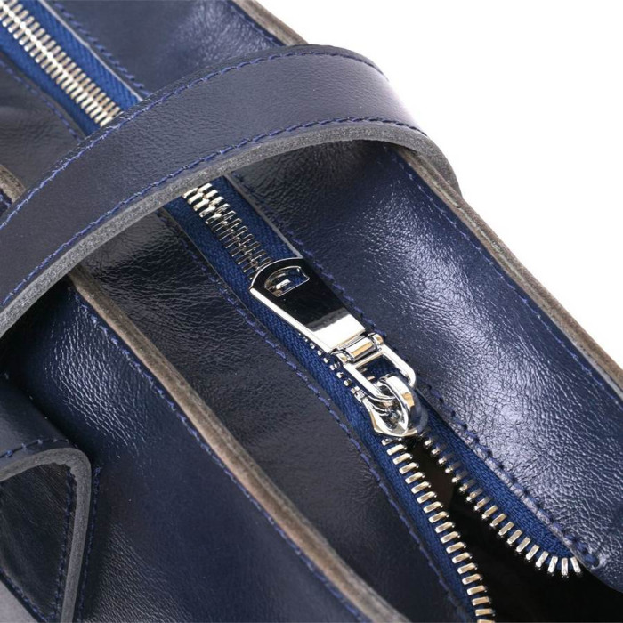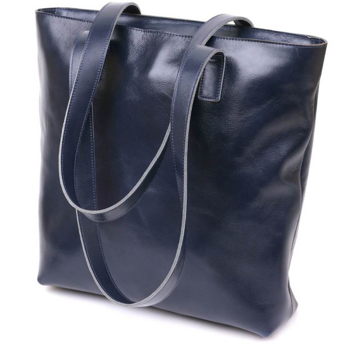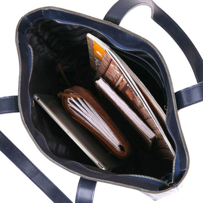 Містка сумка-шоппер в сучасному та модному дизайні від українського виробника. Матеріал виготовлення – натуральна шкіра високої якості з відмінними експлуатаційними показниками. Закривається сумка на блискавку, всередині одне просторе відділення та потайна кишеня. Колір – синій з відливом, що виглядає дуже красиво та стильно, фактура – гладка.