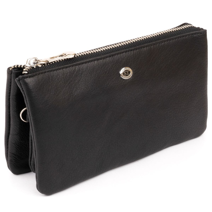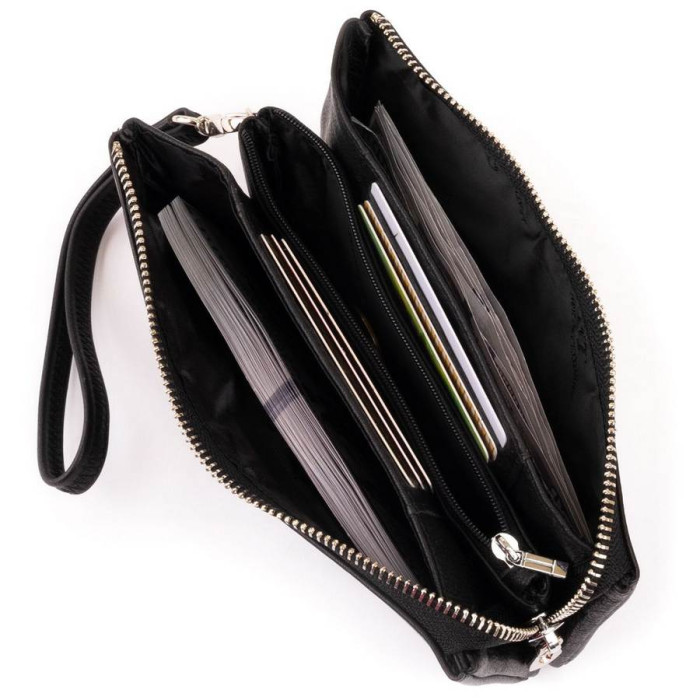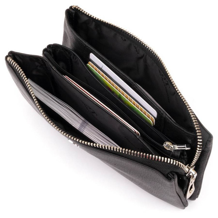 Чорний універсальний клатч відрізняється своєю місткістю. В дану модель легко поміститься ваш смартфон. Таким чином модель здатна замінити вечірню сумочку. Носити ж клатч можна за допомогою шкіряного ремінця на зап'ясті. Дві містких кишені допоможуть зручно розкласти вам гроші, також клатч має досить слотів для кредиток. Перевагою чорного кольору є те, що він не прив'язує вас до певної колірної палітри в гардеробі. Він підходить під все.Сам клатч м'який і приємний на дотик. Усередині клатч зроблений з натуральної шкіри і щільного текстилю. У комплекті йде фірмова коробка з логотипом бренду. Шкіряний клатч стане найкращим подарунком для близької людини.